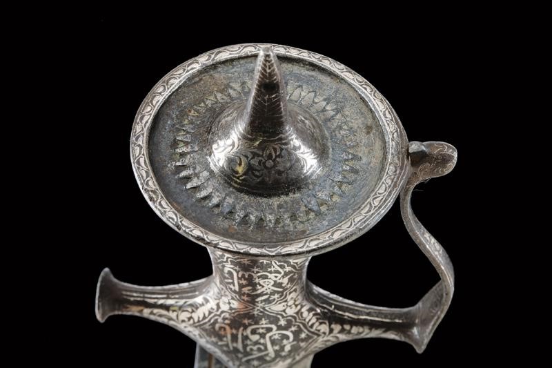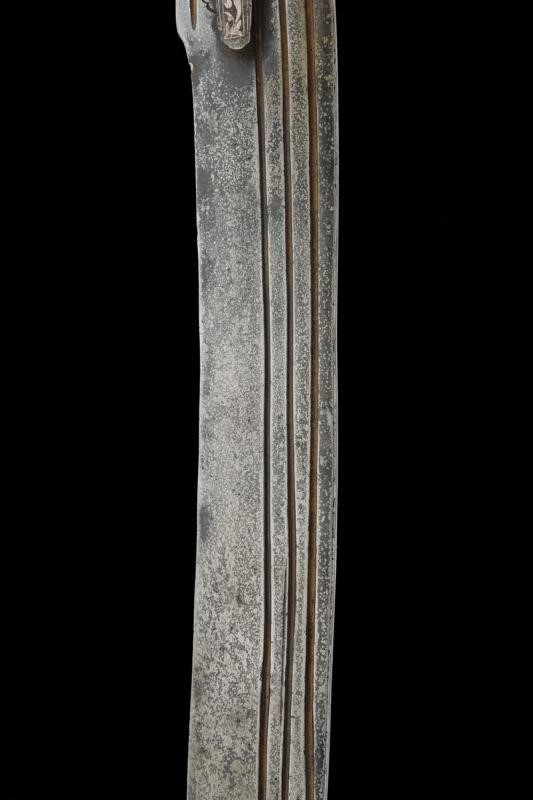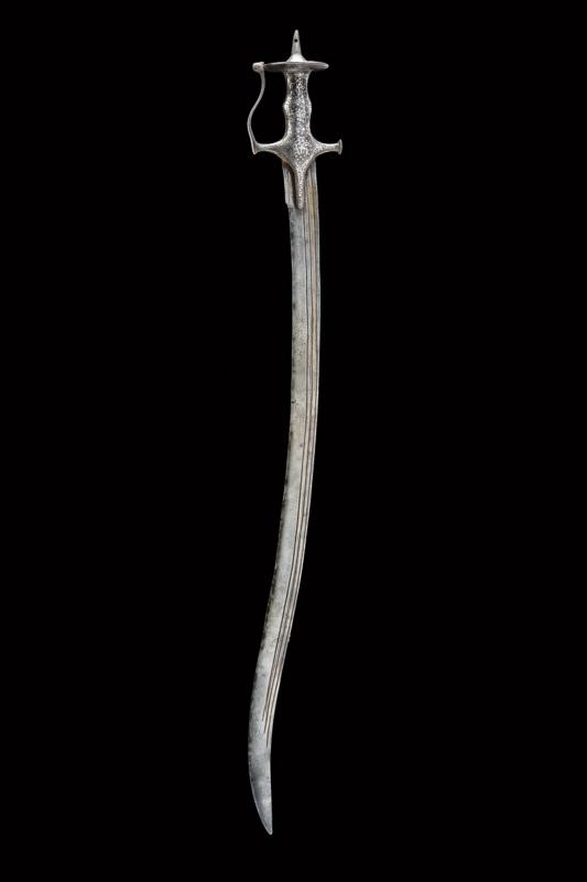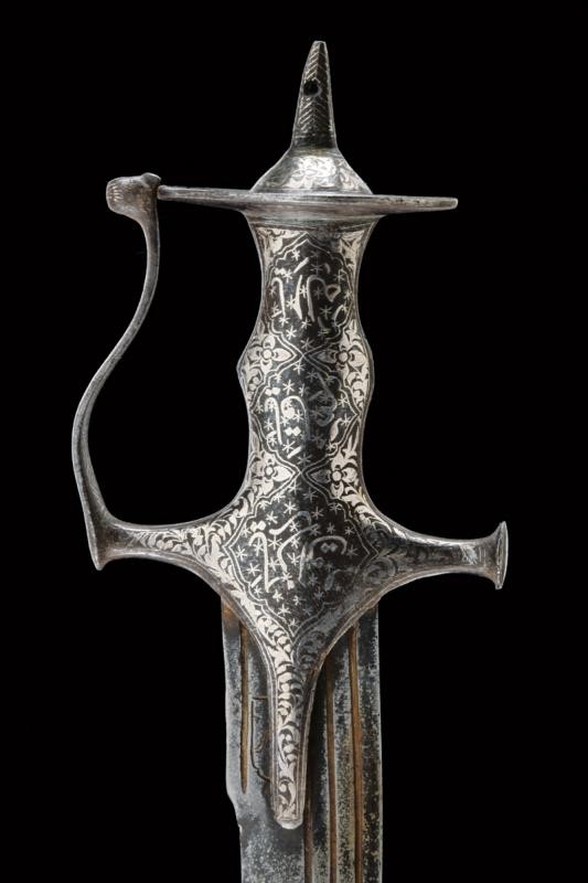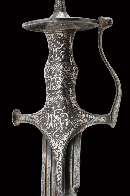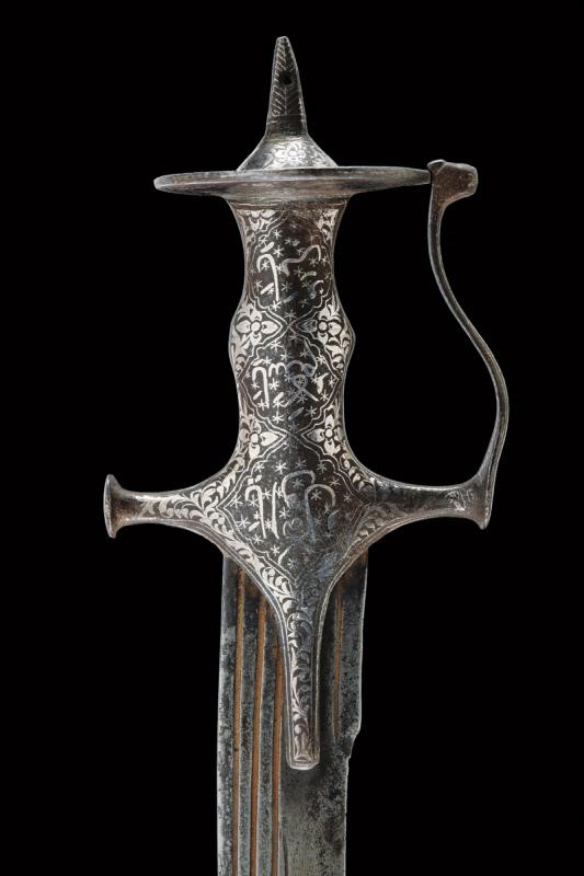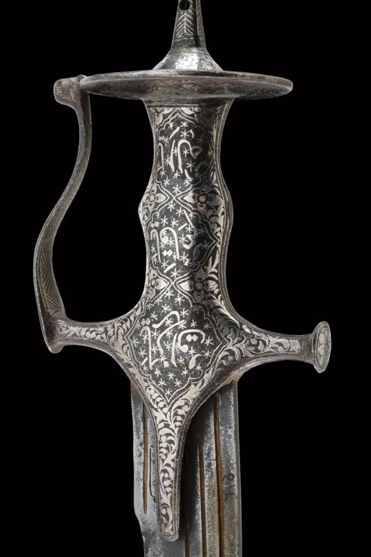 Counter-curved, tipped, single-and short false-edged blade, with flat sides and triple fuller. Fine iron hilt of typical shape, with langets, short buttoned quillons, guard joined to the pommel and with a cusped disc. The finely silver-inlaid surface with cartouches featuring inscriptions in Islamic characters on a star background and surrounded by floral motifs. The disc of the pommel is also inlaid on the lower side with inscriptions, the upper side decorated with the classic sun rays and with silver-inlaid floral motifs at the base of the cusp. The guard also inlaid on both sides with geometric motifs inside and with floral motifs otside, like the rest of the hilt.