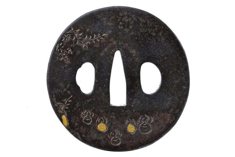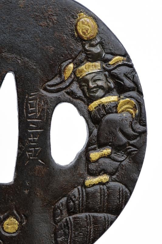 Made of iron, maru gata, niku bori with shakudo and gilding, kaku-mimi. The omote side with the carved portrait of the god of fortune and abundance Daikokuten, dancing above the traditional rice bales, holding his golden hammer. Mei 'Kunihiro'. In kiri-box.