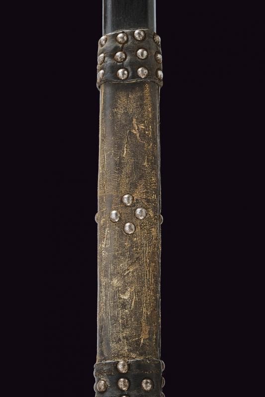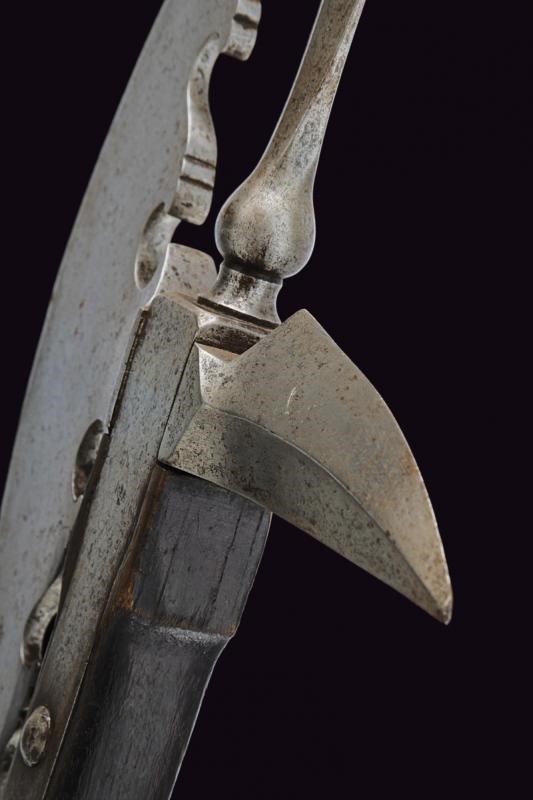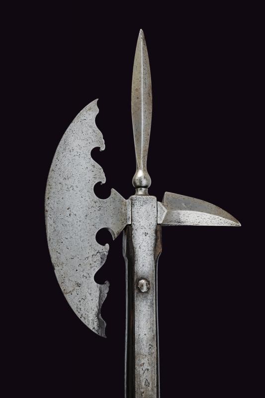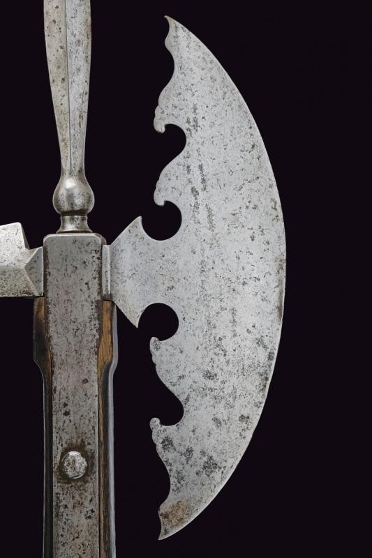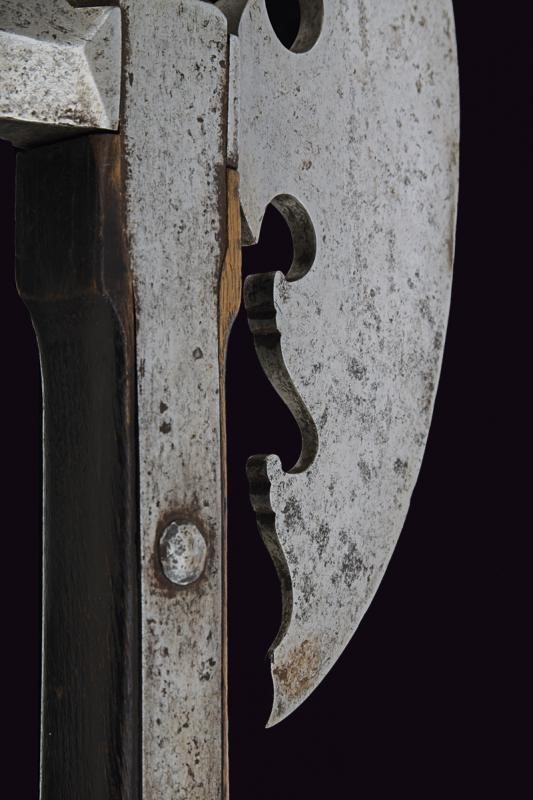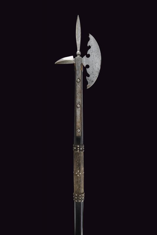 Made of iron, with elegant axe with long convex cut increasing in thickness towards the quillon block, the back carved in the shape of waves, solid rear fluke with straight base and curved cut. Spear-shaped ribbed cusp on a spherical base. Flat bands worked in one piece with quillon block. On a firm blackened and partially leather-covered wooden shaft with convex iron rivets.