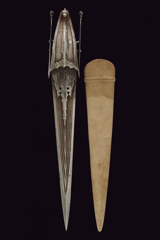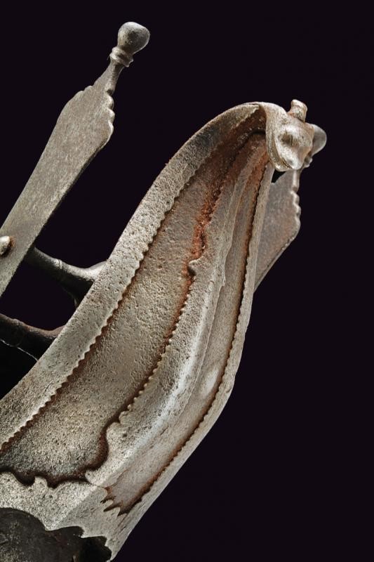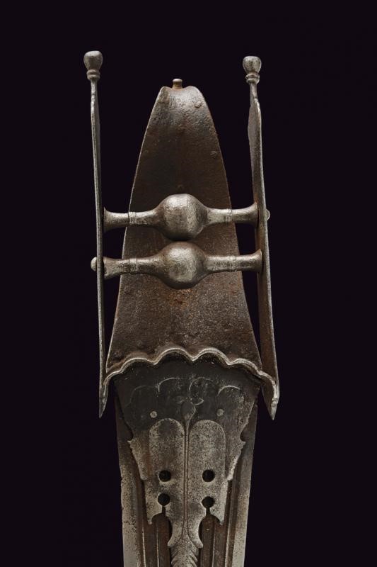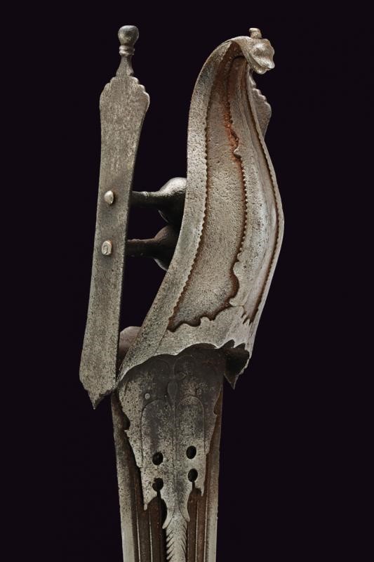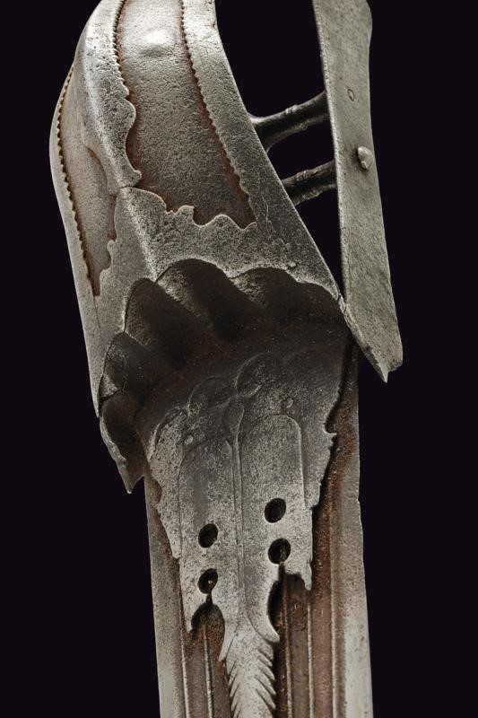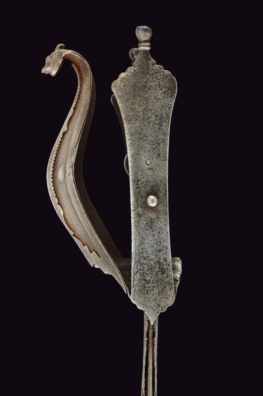 Long, straight, double-edged, damask blade, slightly enlarged and ribbed in the middle at the tip, decorated with grooves converging in the centre, held at the base by two engraved and moulded iron plates. The hilt with two side bands joint by the grip consisting of two small crossbars provided with a large central knot. The typical large protection valve also made of iron, counter-curved and ending with an animal's head, reinforced by serrated frames. Leather-covered wooden scabbard, of more recent production.