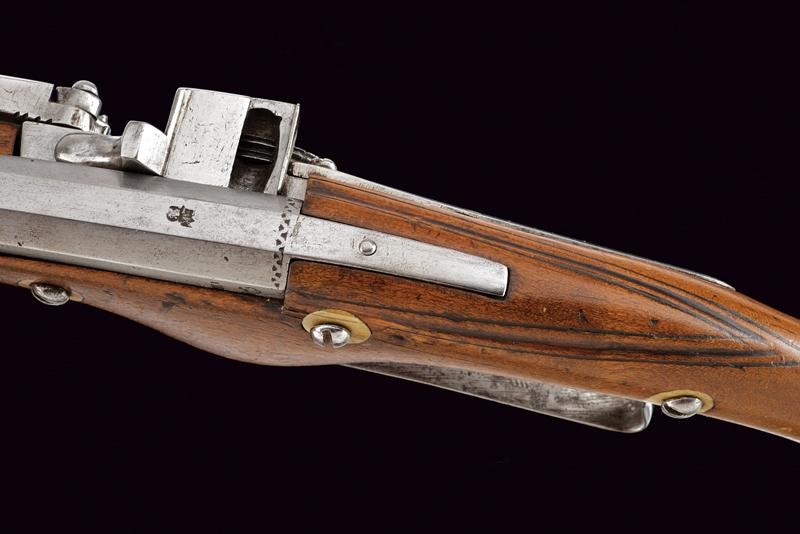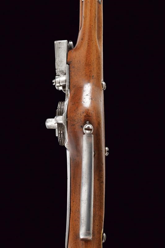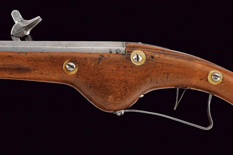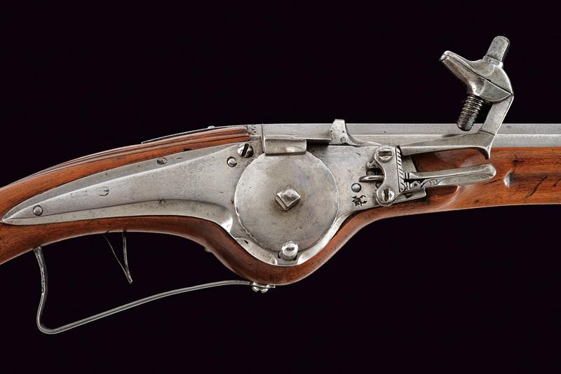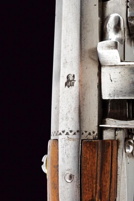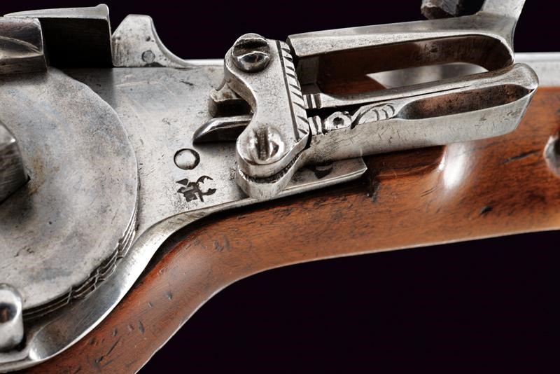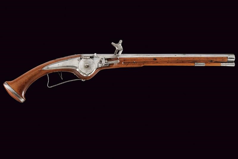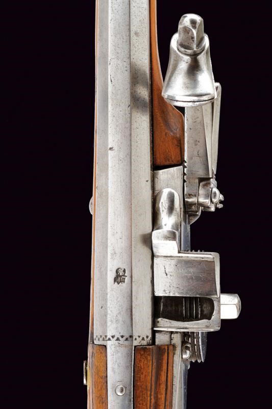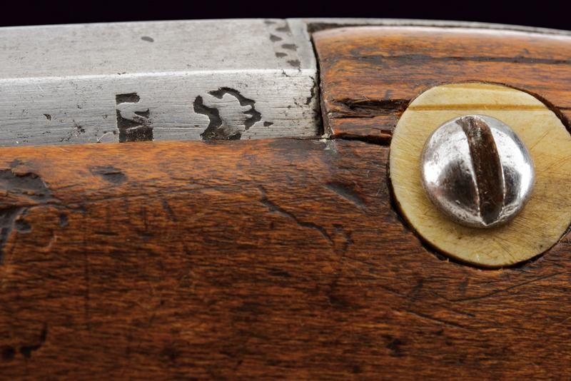 Smoothbore, octagonal, 13 mm cal. barrel, the base with frame and three marks including Suhl's hen; smooth tang. Typical external wheel lock with clearly visible mark, with sliding pan cover, oblique borders. Wooden, full stock (signs of time) with iron mounts, the three screws of the counterplate lined with bone. Iron-tipped wooden ramrod.