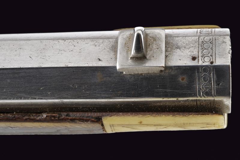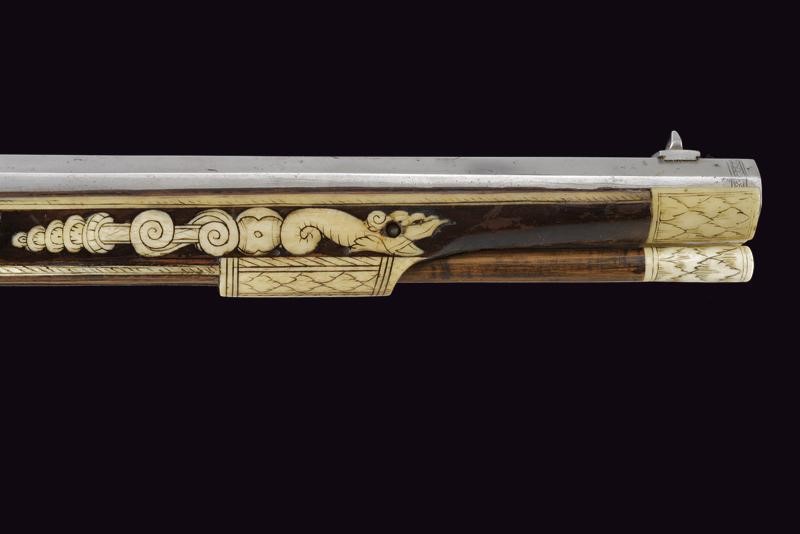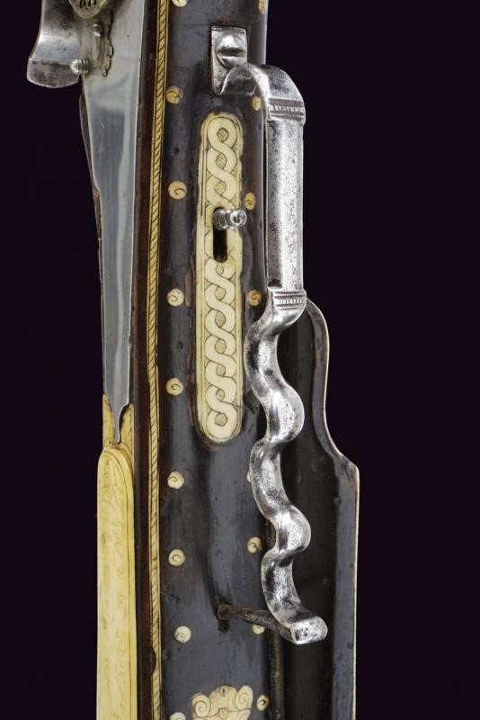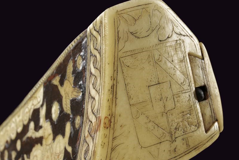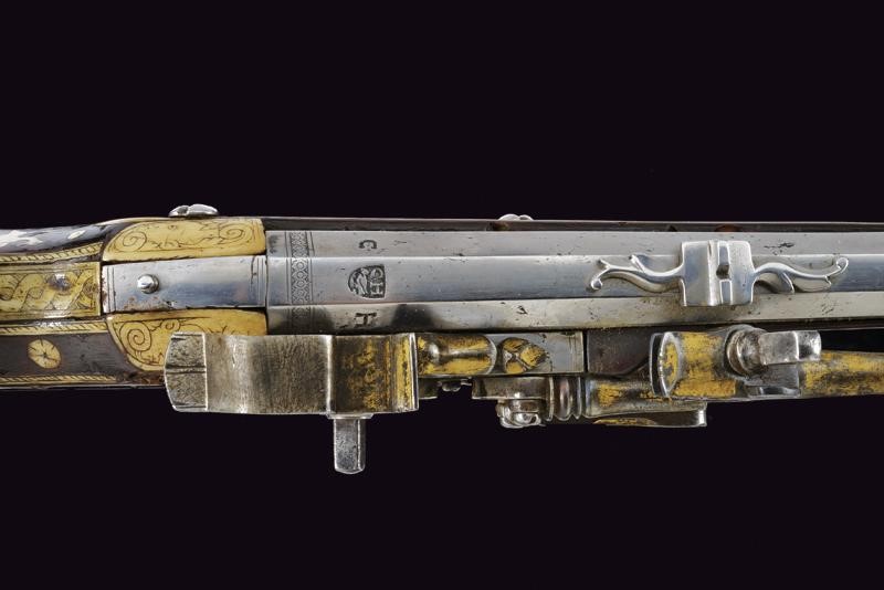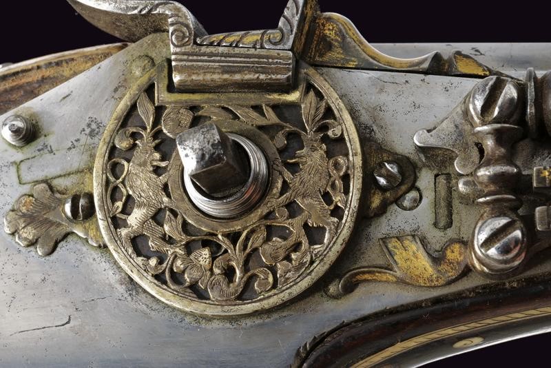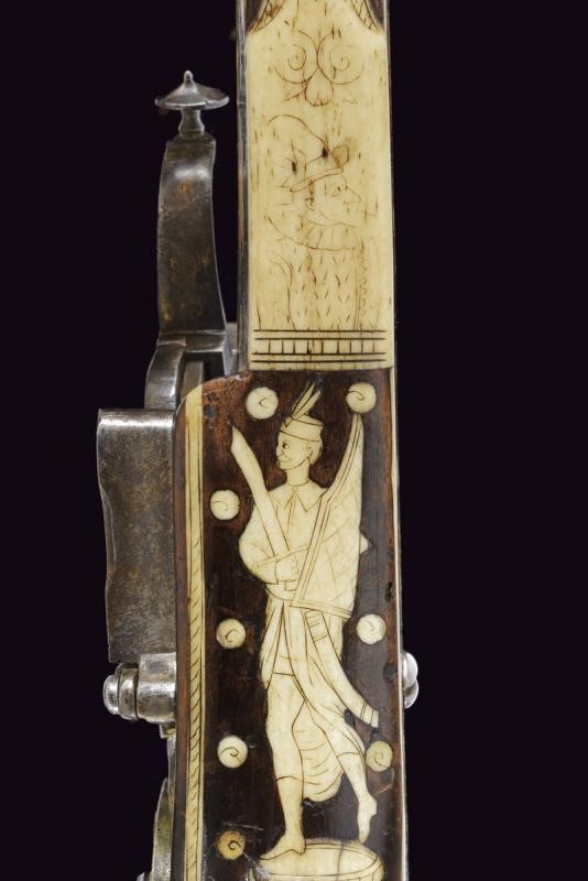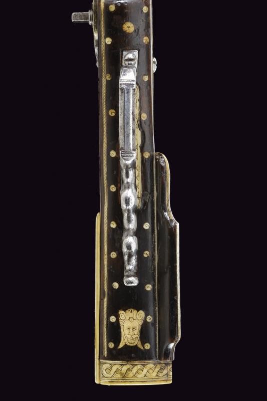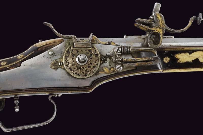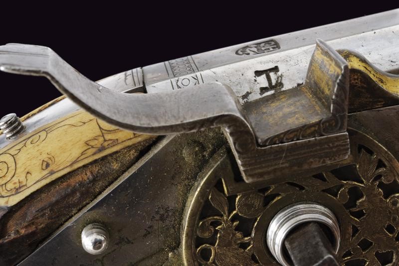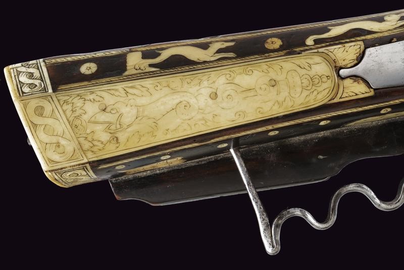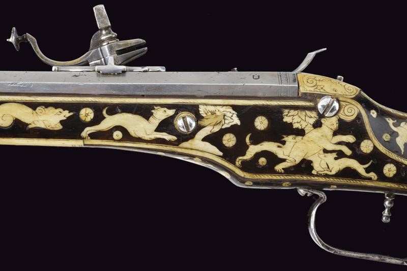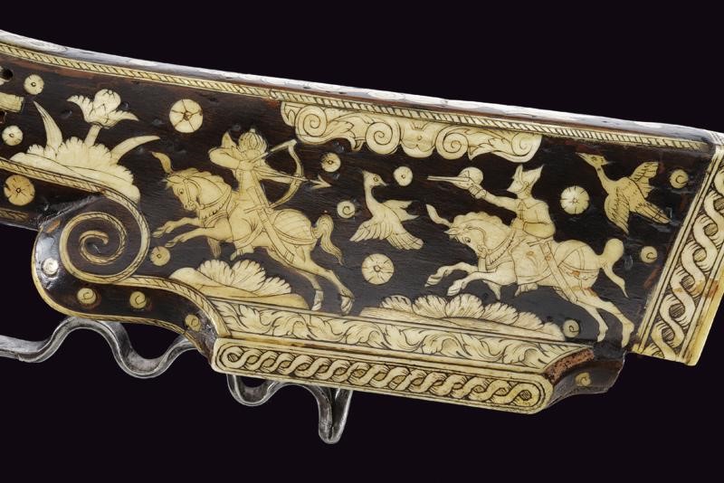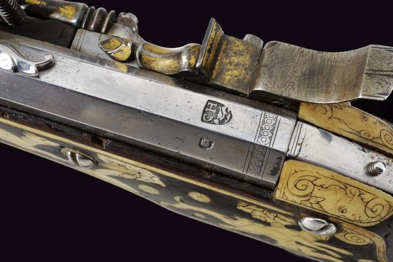 Rifled, octagonal, 12 mm cal. barrel at the nozzle, provided with iron foresight and rear sight, and engraved frame at the breech and nozzle, a well marked shield on the back of the breech featuring the letters "CH" in relief surmounting a bird, the coat of arms with the same letters on the side, "C" on the left "H" on the right. Flat and smooth lock. The wheel is protruding from the plate and is inside an elegant silver-plated metal mount elegantly pierced with two rampant lions framed by racemes. The cock and its spring are engraved, the former with an animal's head, and both with remains of an earlier gilding, like the pan cover. The pan is provided with a long spark arrester. Wooden full stock with a few woodworm holes and richly decorated with engraved bone-inlays. Decorative elements on the right side: greyhounds chasing hares and grotesques with dragon's heads; on the lower side a mask with a devil face and the effigy of a Hungarian style armed warrior (maybe an Hajduk), and the portrait of a gentleman, the butt with other masks and grotesques on the back; the left side again with greyhounds and hares, but also featuring a hunting scene of a fight among a bear and dogs, and a beautiful scene of a fight between a Turkish knight armed with a bow and a raider firing his pistol. Bone butt-plate with remains of a heraldic coat of arms surmounting the inscription 'V de T'. Bone patchbox with remains of grotesque engraving.