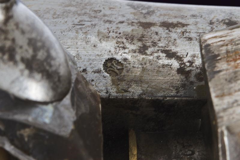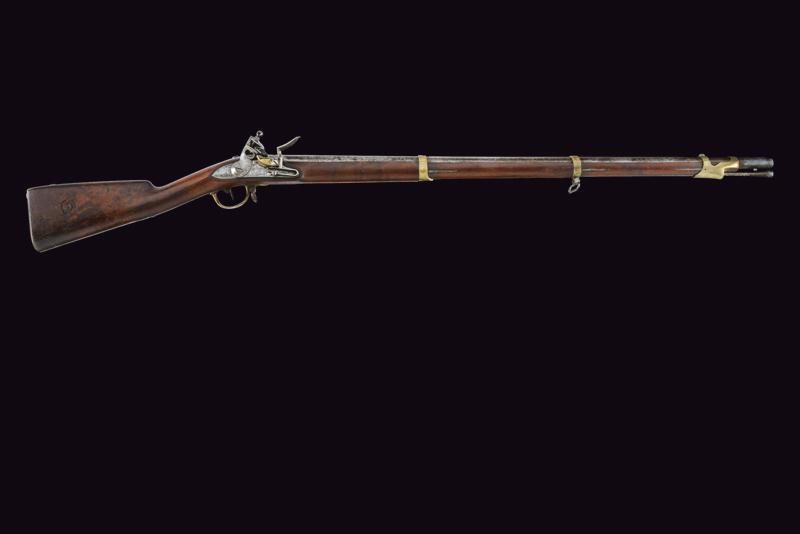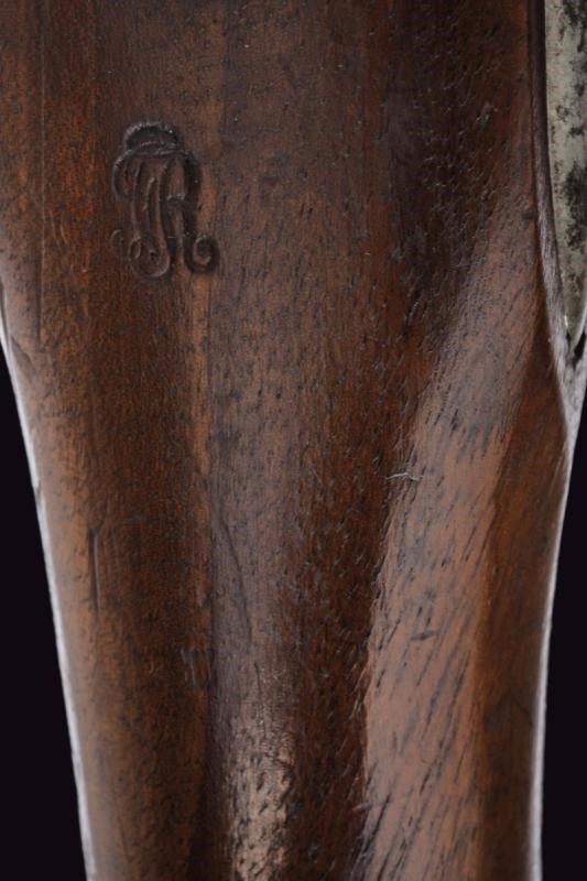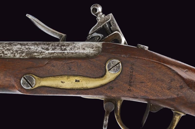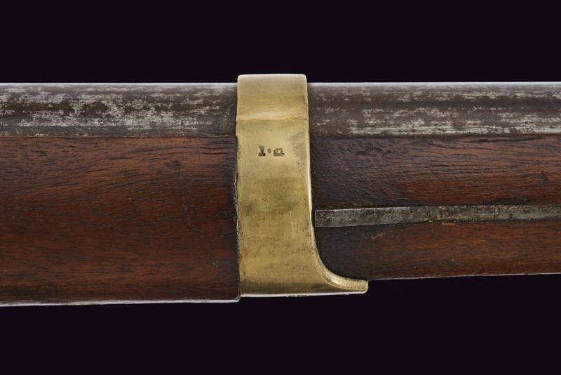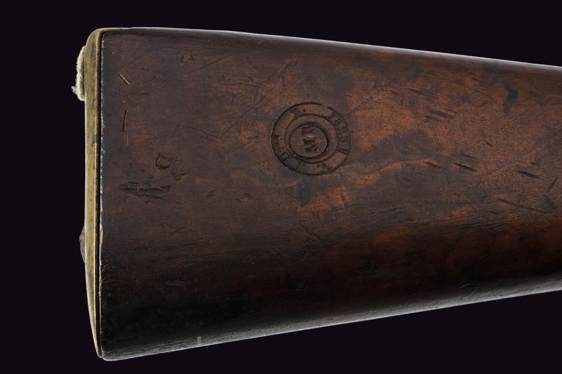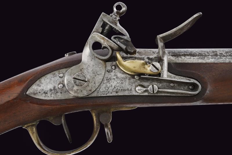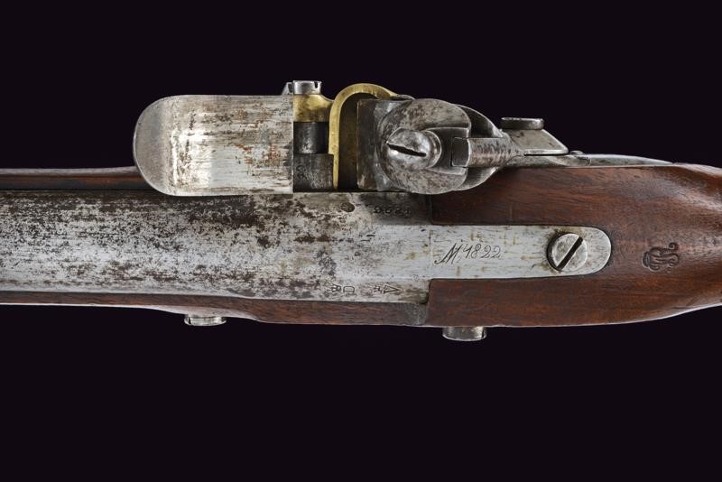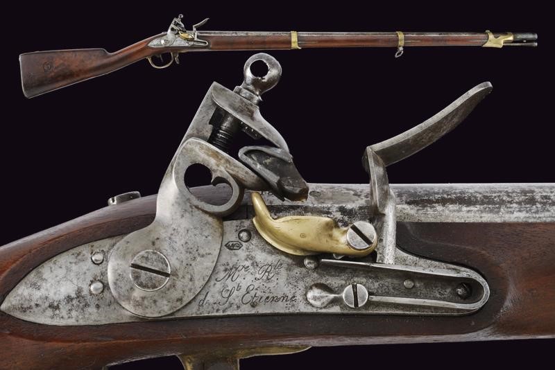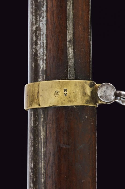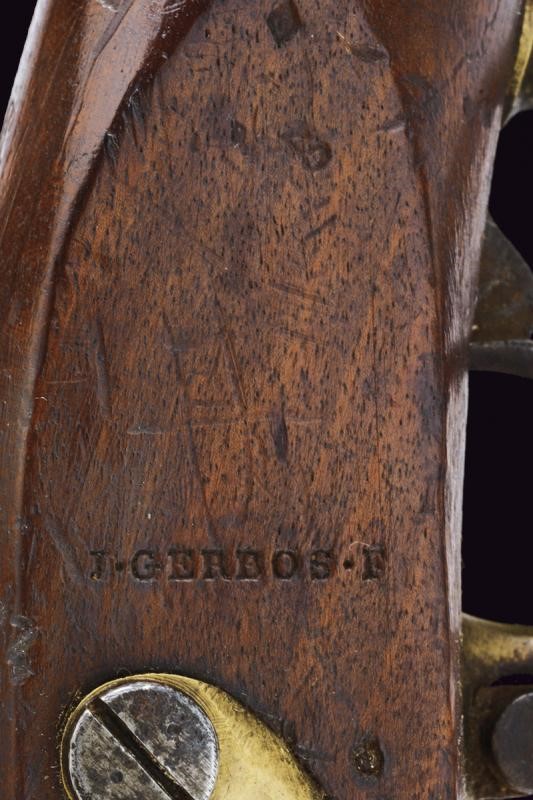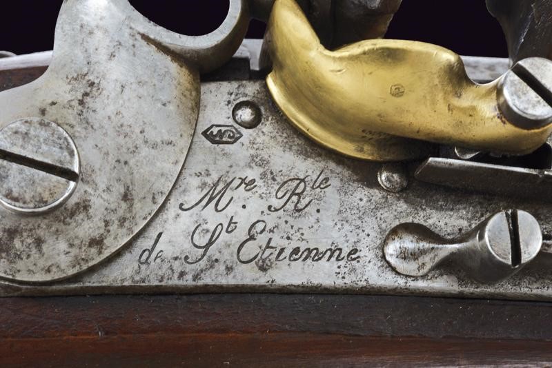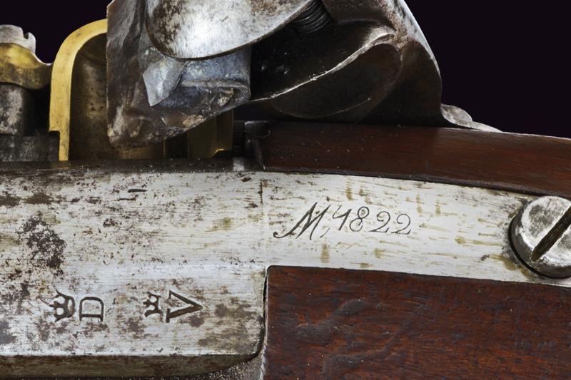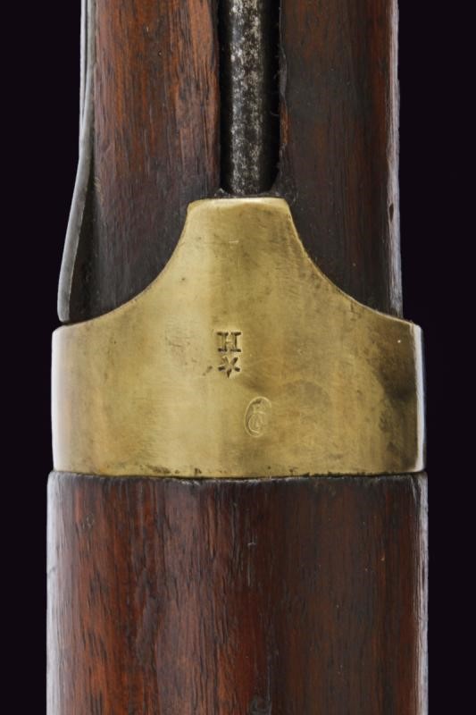 Round, smoothbore, 17 mm cal. barrel with octagonal base marked "D" and "V" under crown, "W" under star and year "1823", clutch for the bayonet, foresight on band; tang with model inscription. Flintlock marked "M.re R.le of St. Etienne" and with mark. Wooden full stock stamped "MR" of 1823, "D" under crown, "I. GERBOS . F" and others with brass mounts with marks("G" under crown, "H" under star). Iron ramrod.