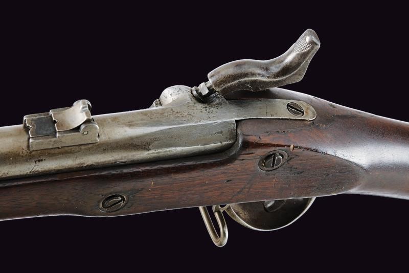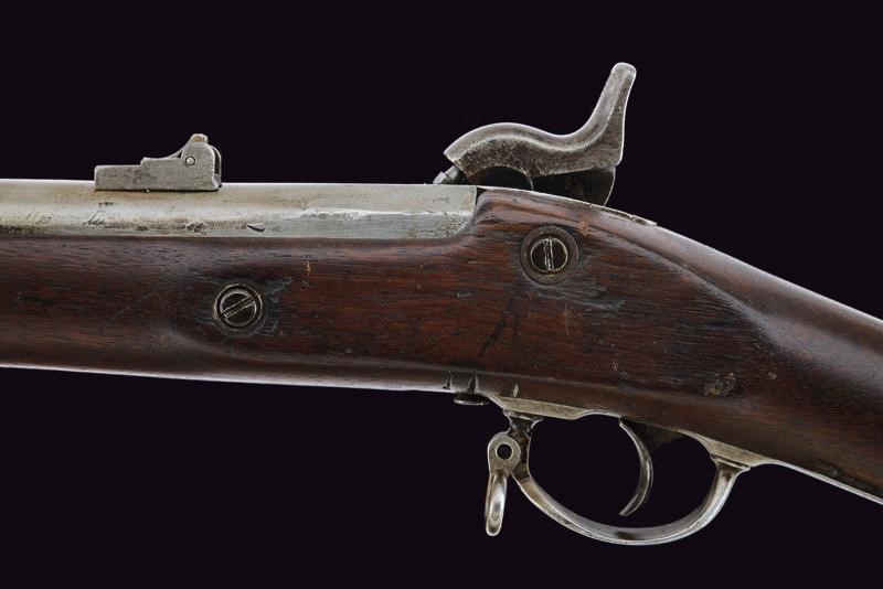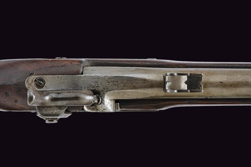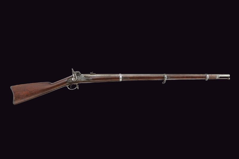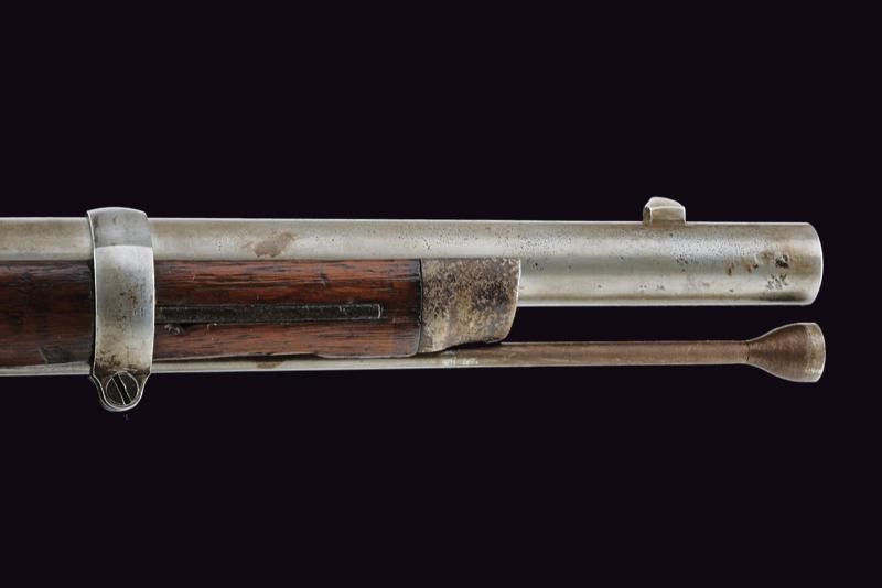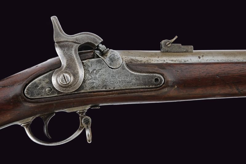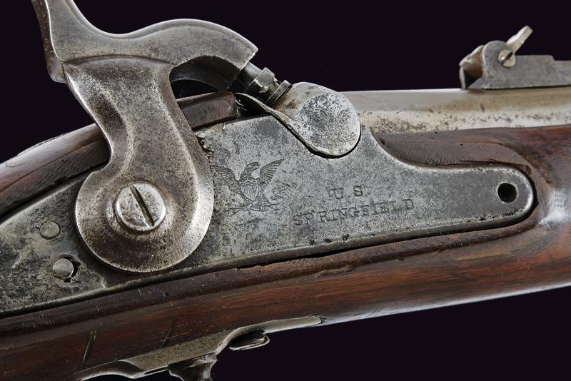 Round, rifled, 14 mm cal. barrel (bore with pitting, slightly visible rifling), octagonal at the base, rear sight and foresight; lock marked "US SPRINGFIELD" and with American Eagle. Wooden stock with iron mounts, butt plate marked "US", browned barrel brackets. Iron ramrod.