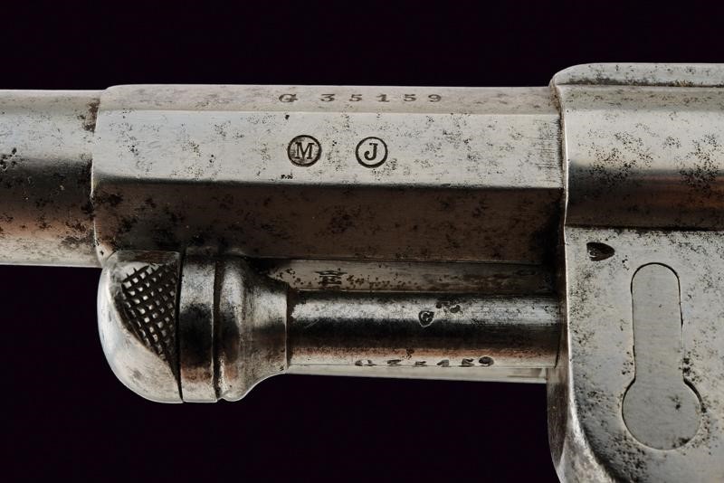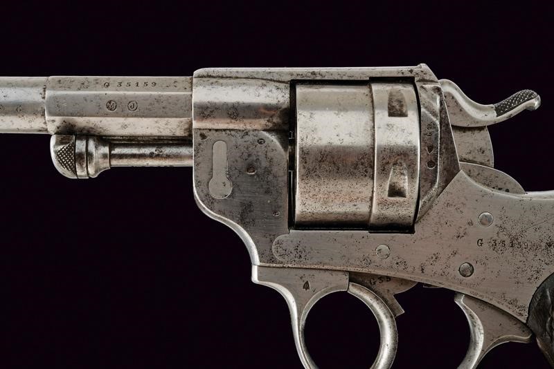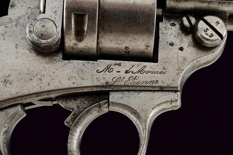 Two-stage, octagonal, round, 11 mm cal. barrel provided with foresight, bearing the markings 'S.1877', 'Mle 1873', marks and serial number 'G35xxx'; smooth, six-shot cylinder, marked with crowned 'E' and with the same serial number. Frame bearing marks, serial number and inscription 'M.re d'Armes St. Etienne'; checkered wooden grips, lateral extractor, ring for the strap. Working mechanism.