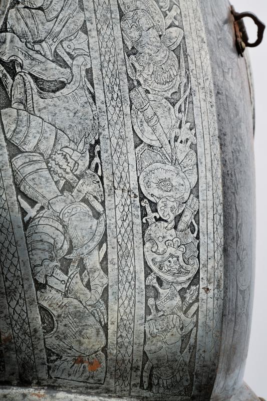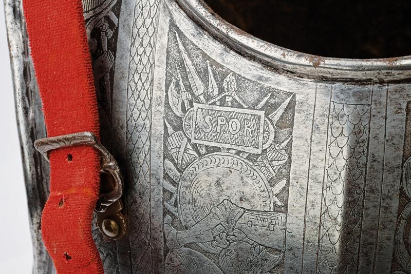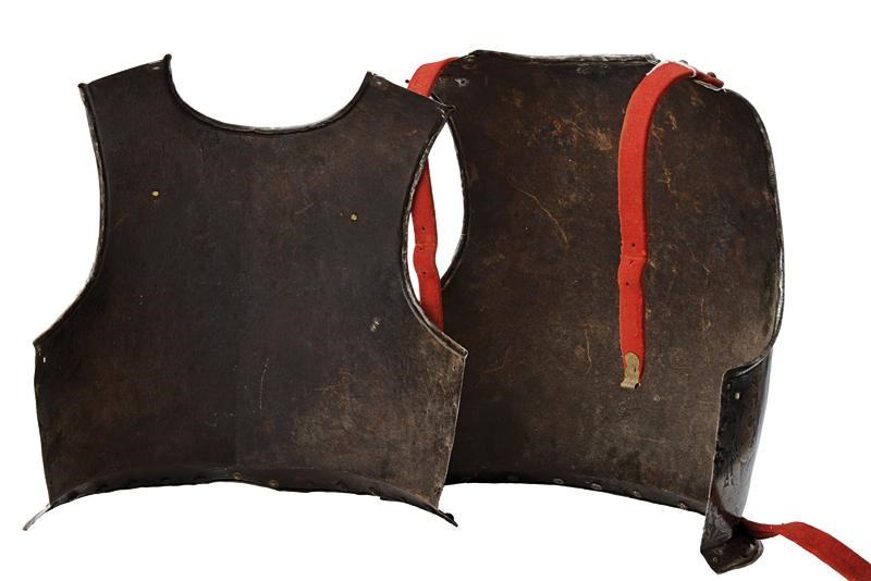 Made of iron. Breastplate ribbed at the center and slightly rounded. Protrusion, with brass rivets (a couple replaced). Neckline, gussets and lower border with smooth ropes. Inside with exfoliation. Back decorated with smooth cords. Both decorated with bands of the Pisan type (probably the most recent engraving) with trophies of arms and armour. The more recent straps covered with red velvet.