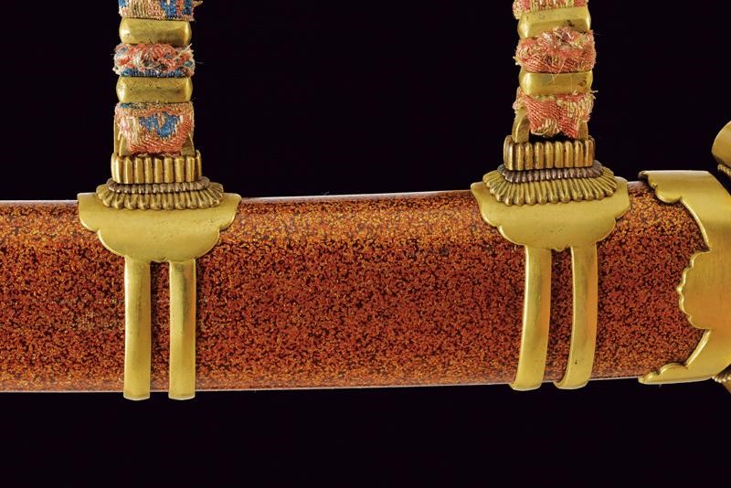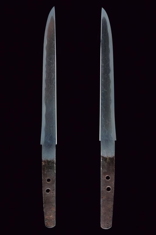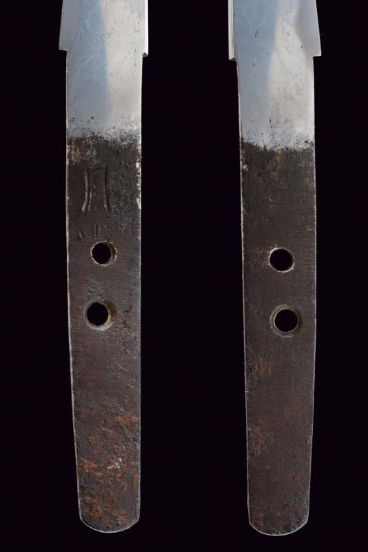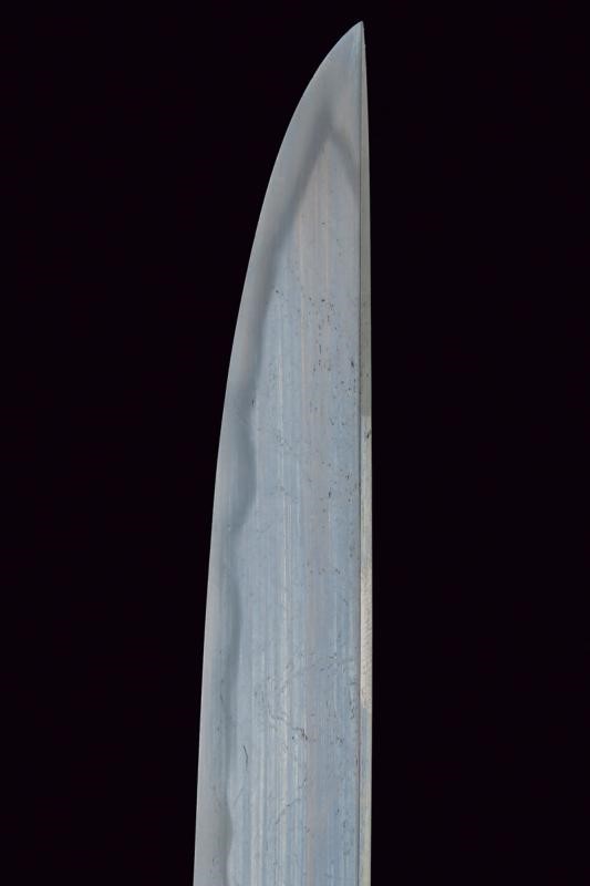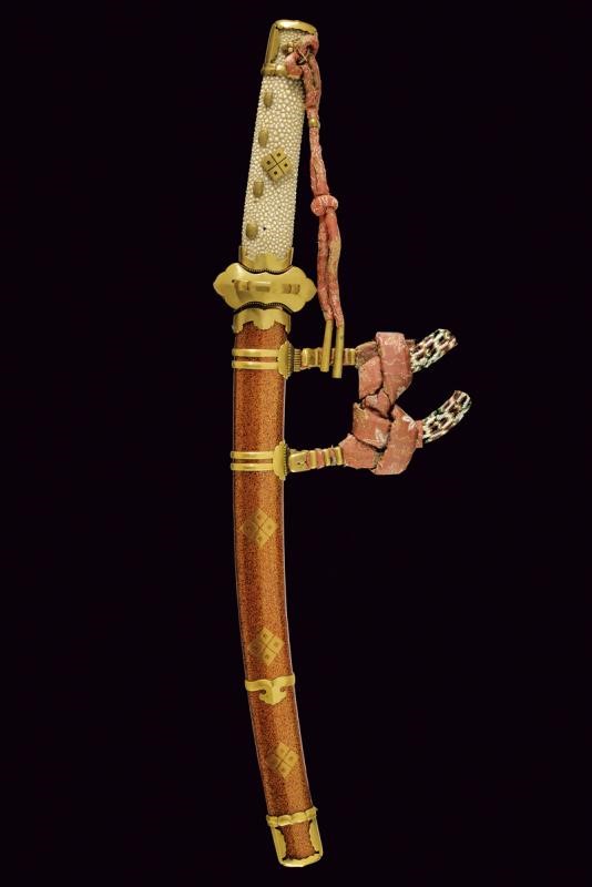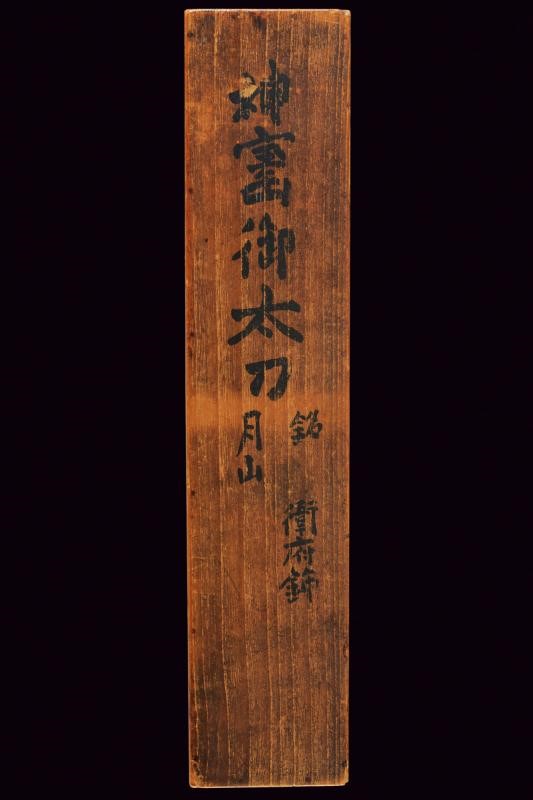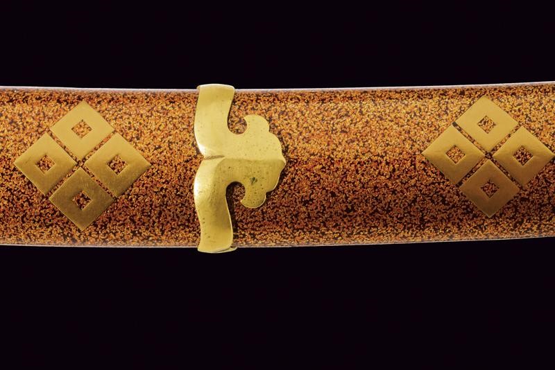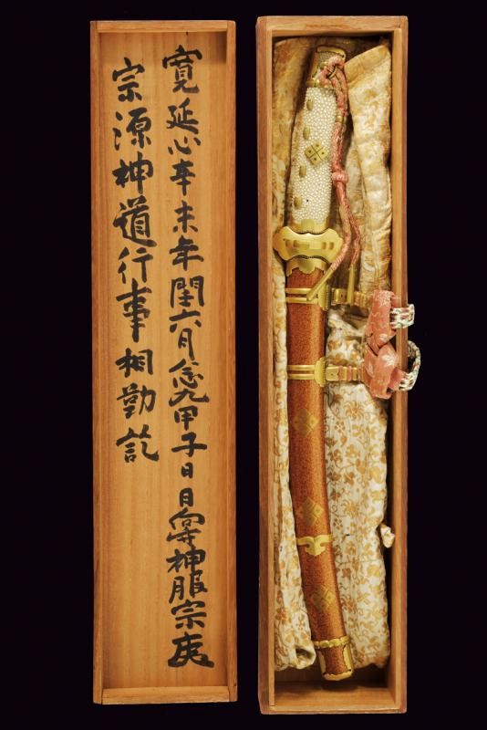 Nagasa of 16.6 cm. Sugata: hira zukuri iorimune musori; hamon: regular suguha in ko nie with sunagashi and kinsuji; hada: evident ayasugi; boshi: suguha, also sunagashi and with a short kaeri. Gilded metal habaki. Nakago mei: 'Gassan', ubu, kurijiri nakagojiri with kiri yasurime and two mekugi ana. In mamorigatana tachi koshirae, original from the Edo period, from the mid-18th century. The koshirae is decorated with Shizuoka clan kamons, silver and gold menuki, also representing clan kamons, and along the tsuka there are small bales of rice of gold, which are often seen before the god Daikokuten as a symbol of prosperity and abundance. In the original wooden box from the Edo period featuring a fragment of the history of this very rare weapon. Outside the inscriptions "blessed tachi", "signed Gassan", and "placed to guard the house", while inside other inscriptions "participation in the Sogen Shinto ritual", "June month of the Kan'en era of the Kanota Hitsuji (1751) cycle", "ceremony took place at the Hyuga temple in the Kinoe ne cycle" and "Shintokuso Ebisu". Middle Muromachi period.