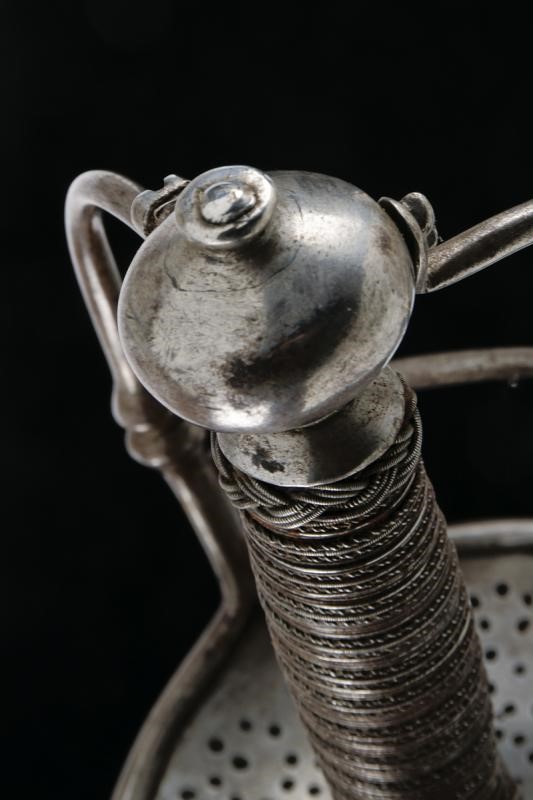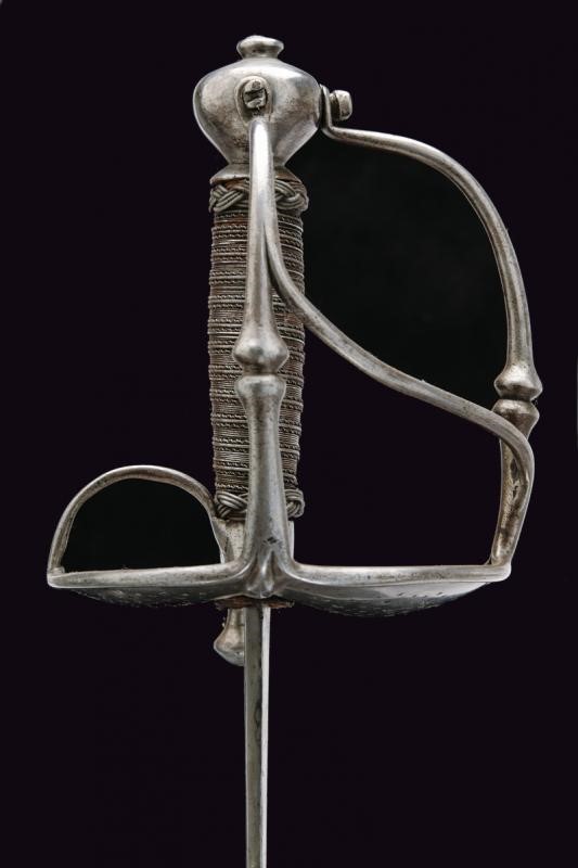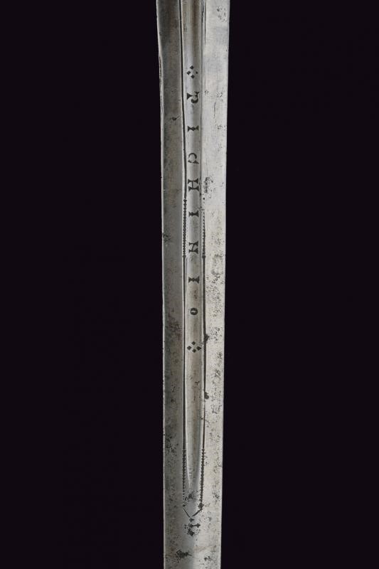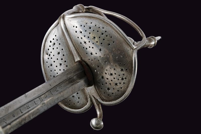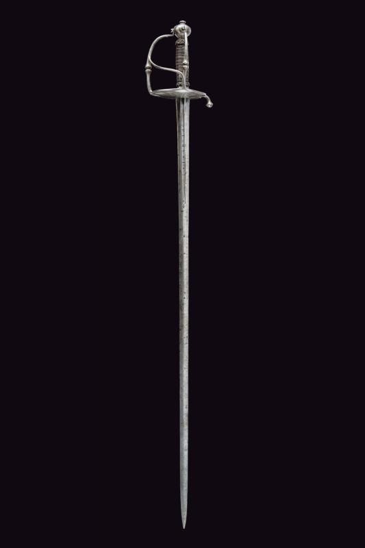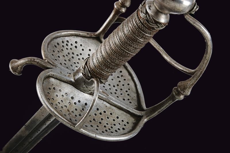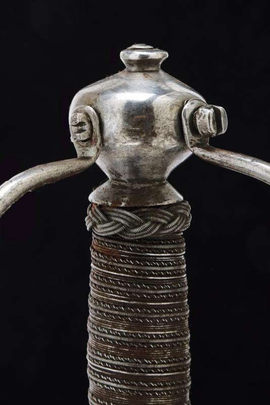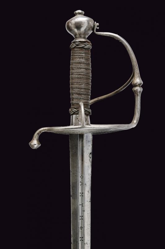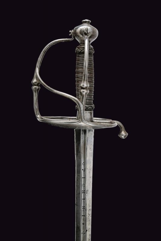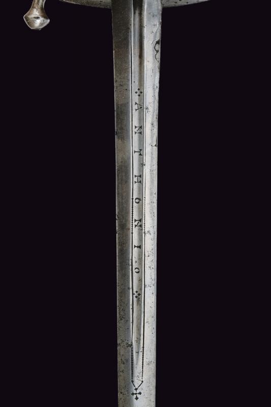 Two-edged straight blade with central groove bearing the signature "ANTHONIO PICHINIO" at the forte. Some pitting. Iron hilt with guard loops decorated with double knots. Pierced valves. Vase shaped pommel. Thumb-ring. Grip covered with iron wire binding and provided with moore's heads.