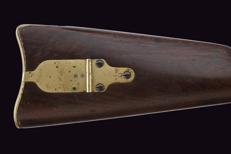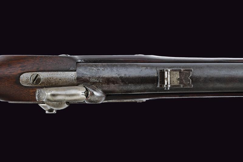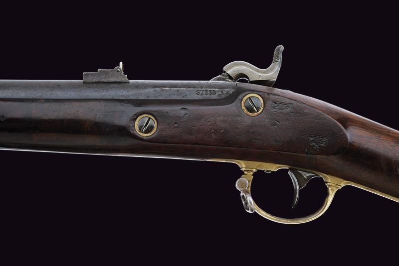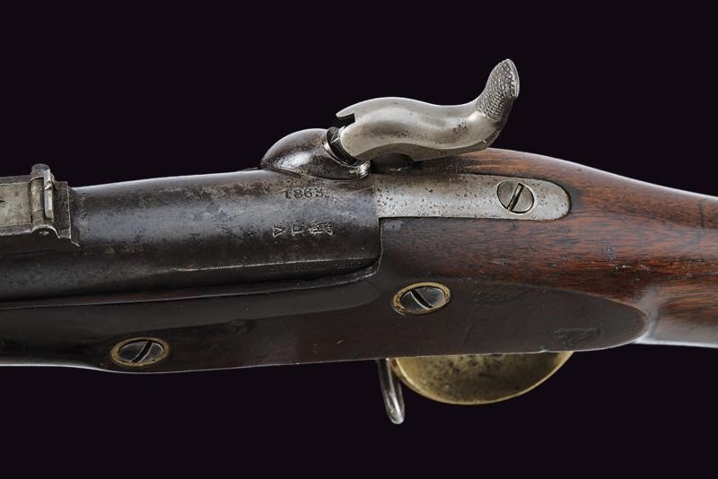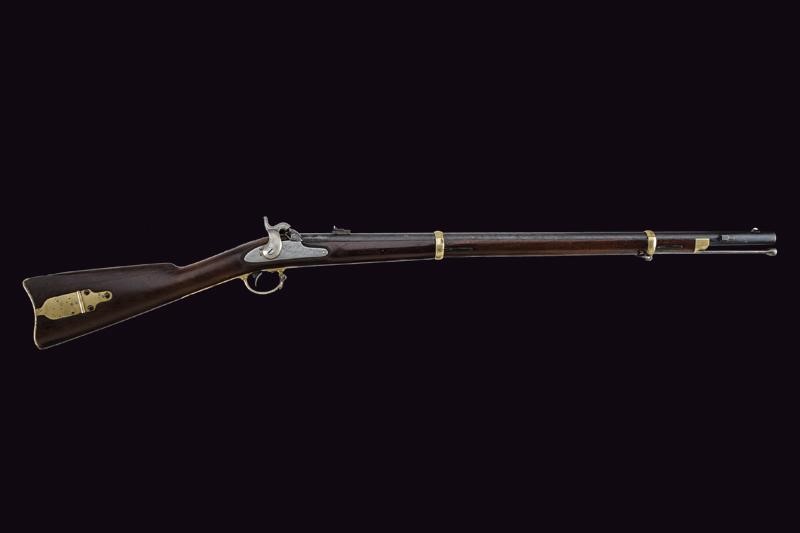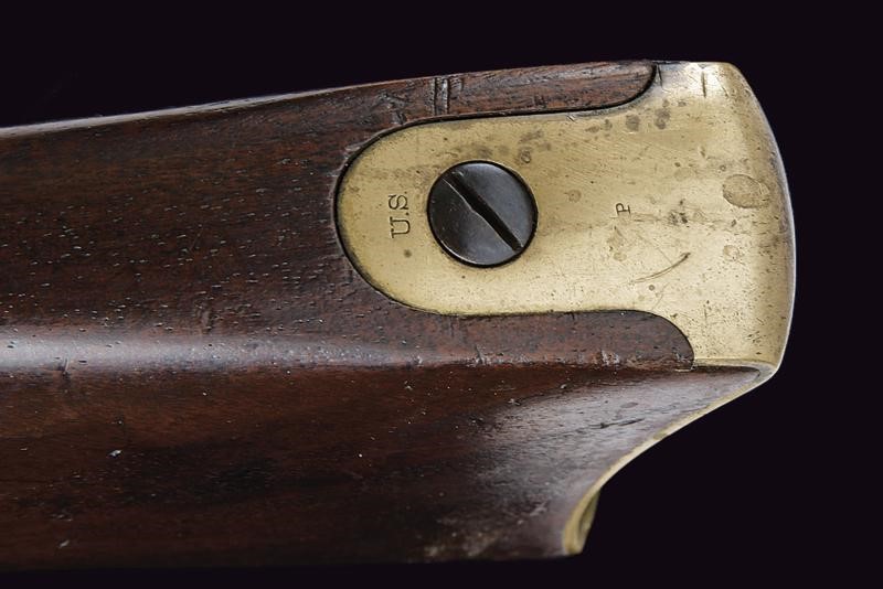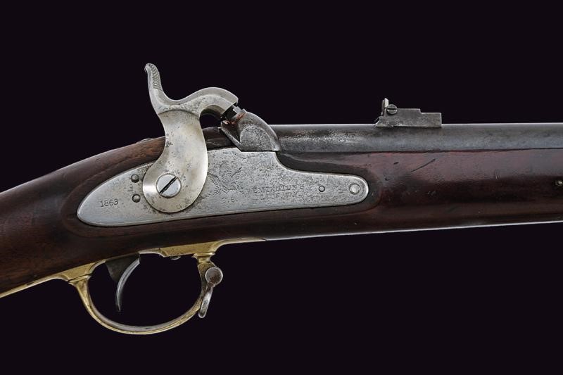 Round, rifled, 58 cal. barrel (clean bore, visible seven-line rifling), provided with foresight and with rear sight with two foldaway sight leaves, featuring the date "1863", "P.", "V.", "R.K.A.", "STEEL" on the breech and marked with an eagle's head. Forward spring lock featuring date "1863", eagle effigy, remains of marks "REMINGTONS ILION N.Y.", "U.S." and mark "L". Full wooden stock with remains of military stamps on the left side. Brass mounts, butt-plate marked "U.S." and "P", bands marked "U". Iron ramrod. Inside the patchbox, replacement nipple. Working mechanism. Rare.