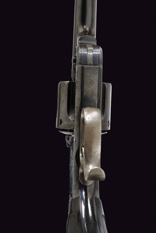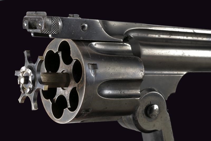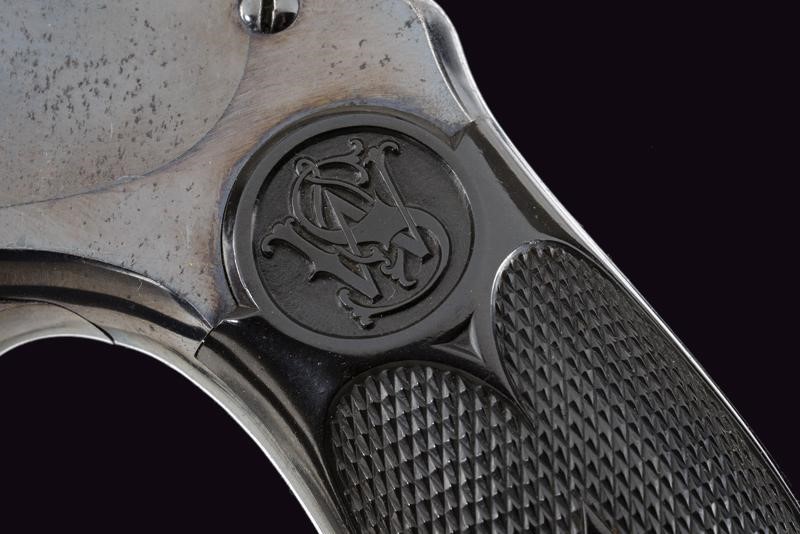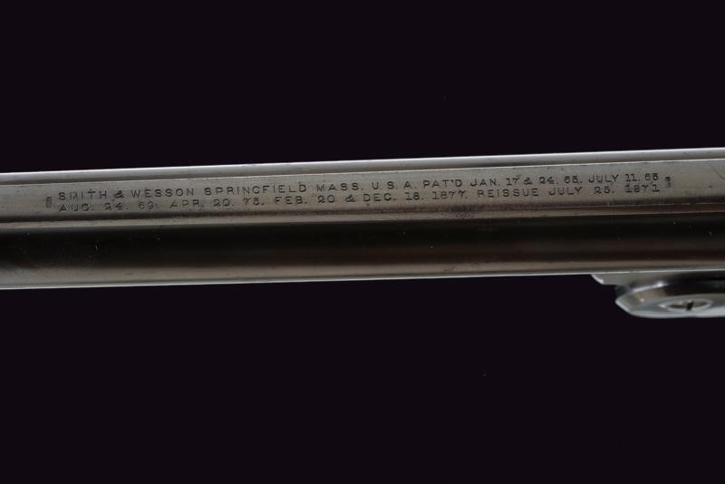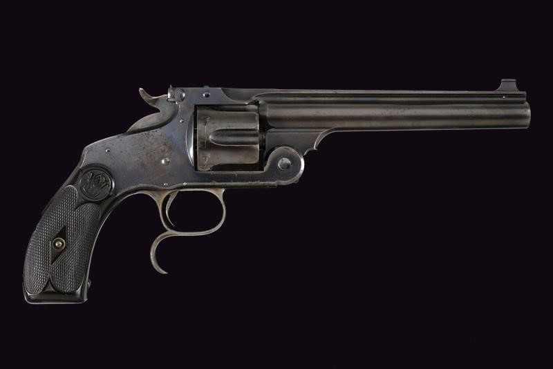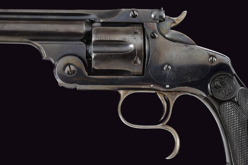 Round, rifled, 8" barrel (clean bore, visible rifling, some signs of use inside), swivelling, with high rib marked with company address and patents in two lines. 10,8 mm cal at the nozzle. Target foresight and rear sight. Grooved, six-shot cylinder (can fit a 44 Russian). Working mechanism. Serial number "20xxx" present on the barrel only. Frame with trigger guard provided with finger support. Barrel and cylinder probably reblued, frame and handle with bluing (probably antique). Checkered rubber grip scales with Smith & Wesson monogram.