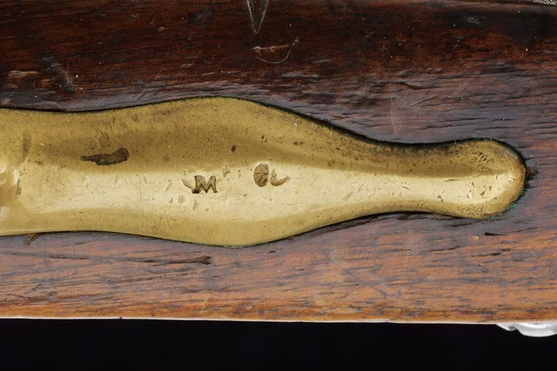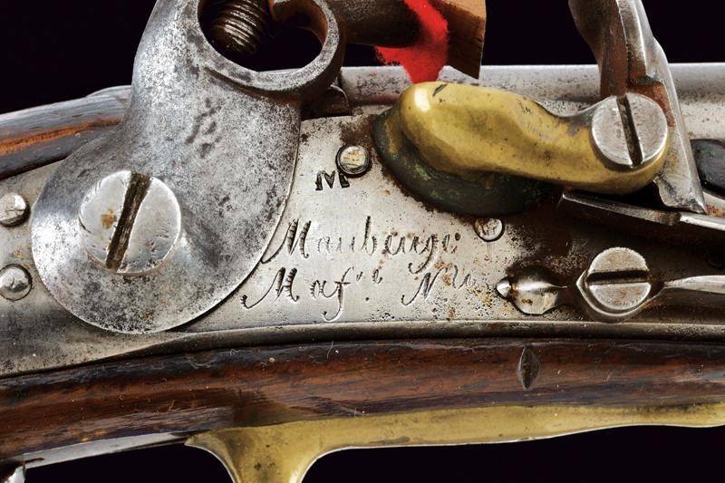 Round, smoothbore barrel, the base marked "H No 60" between stars, "9E" and "RF". Smooth lock plate with the Maubeuge national manufacture mark, marked with an "M", brass pan. Wooden stock marked "RF" behind the counterplate, brass mounts with various marks. Complete with iron ramrod.