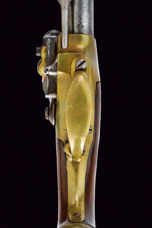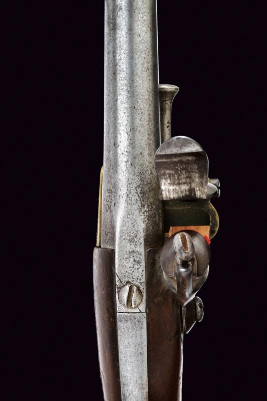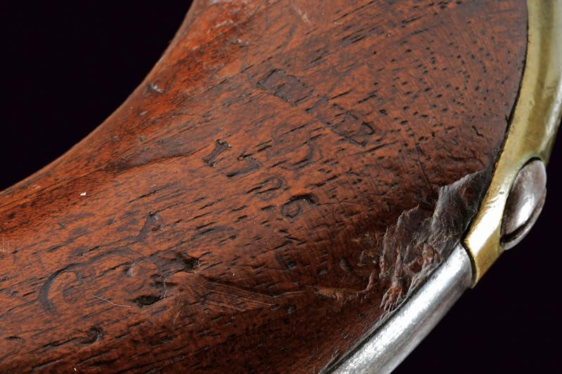 Round, smoothbore, 17 mm cal. barrel, with octagonal base marked "85" and "BM" under crown, smooth tang; lock with brass lock plate engraved "St. Etienne" and marked "J" under crown. Wooden, half stock (small defects and missing parts) with brass mounts, grip scales with remains of marks and inscriptions. Complete with iron ramrod.