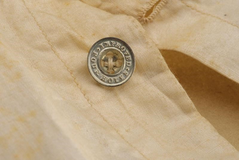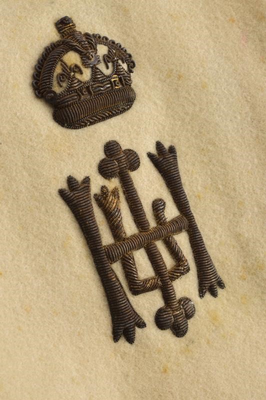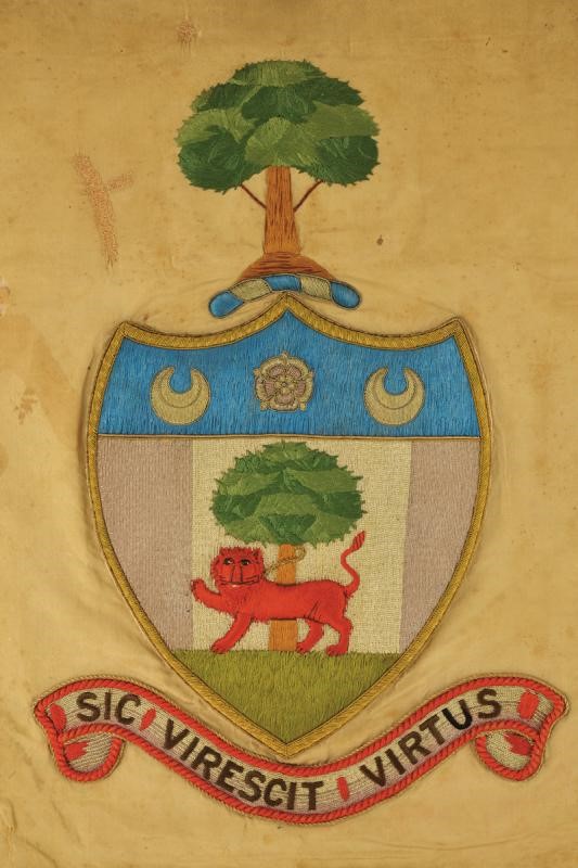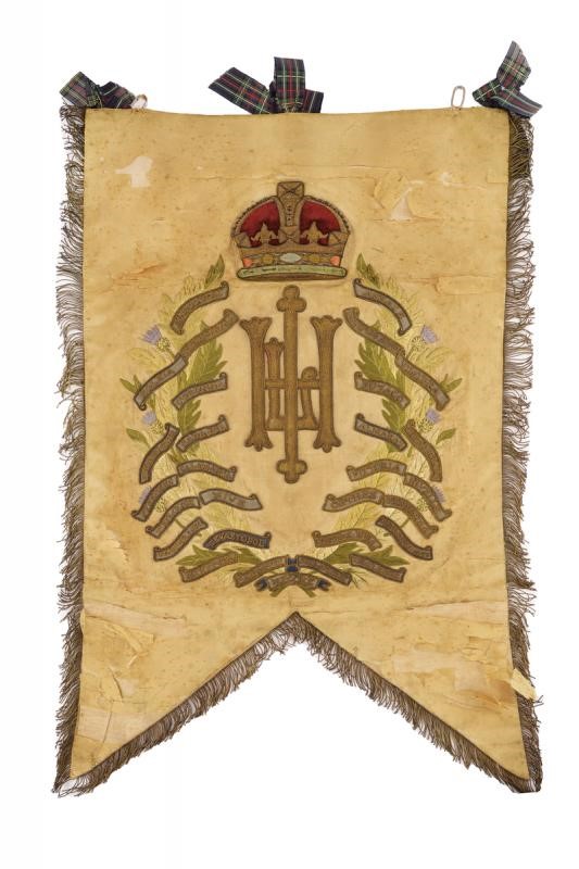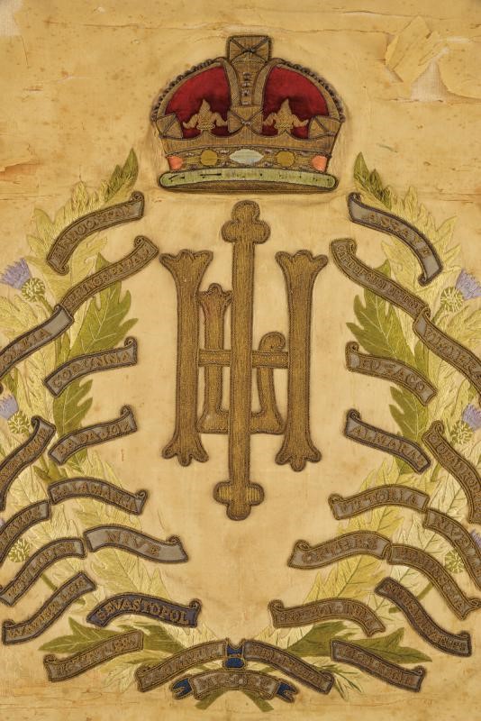 Linen banner covered in beige silk (damaged parts) and with fringes on three sides. The regimental coat of arms in high polychrome stitching and silver and gold thread at the centre of one side. With a tree above, and below a bandeau with the motto 'SIC VIRESCIT VIRTUS'. The other side with the monogram of the regiment under a crown surrounded by 29 names of battles in which the regiment took part. Together with a white cloth and silk waistcoat, with the monogram of the regiment under crown at the front. Buttons on the back.