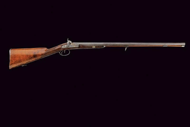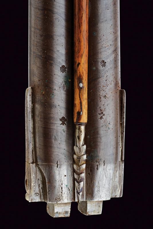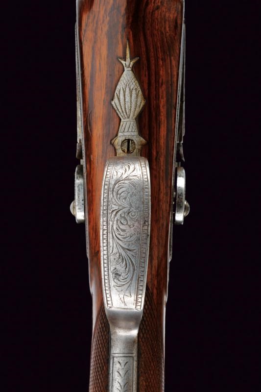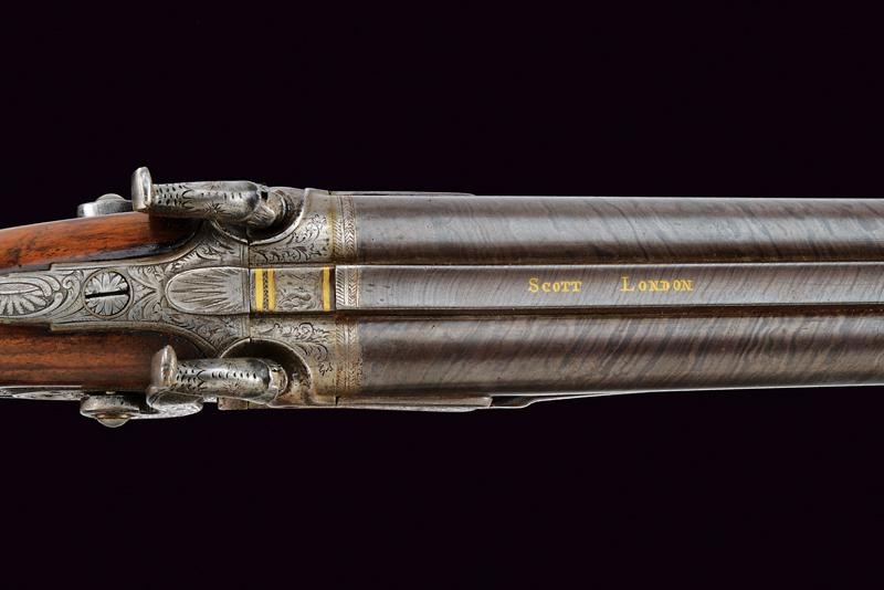 Smoothbore, round, juxtaposed, browned, damask barrels with rib (slightly detached at the base) signed 'SCOTT LONDON' in gold, featuring engravings at the base and gold frames, foresight; the lower part with marks of the test bench, 16 mm cal. at the nozzle ; engraved tang. Forward spring locks signed 'Scott' and finely engraved with floral motifs; briarwood half stock with checkered grip, iron mounts engraved en suite; metal-tipped, wooden ramrod with iron cartridge extractor. Two rings for the strap.