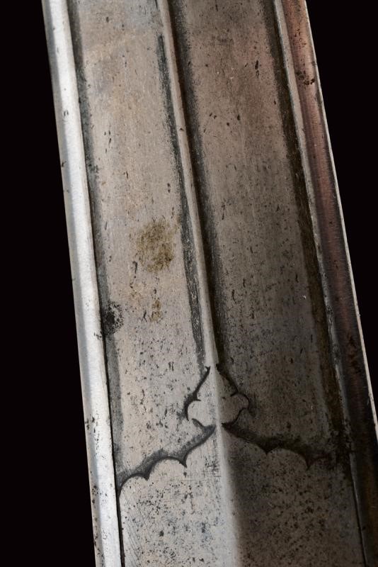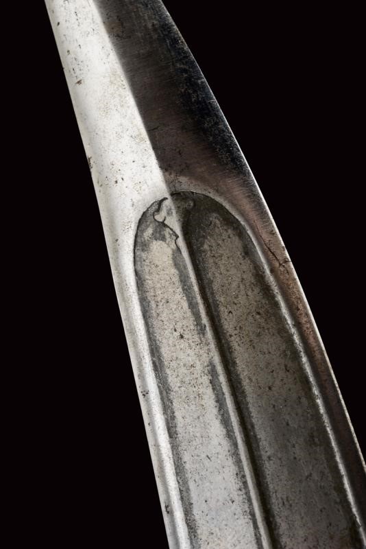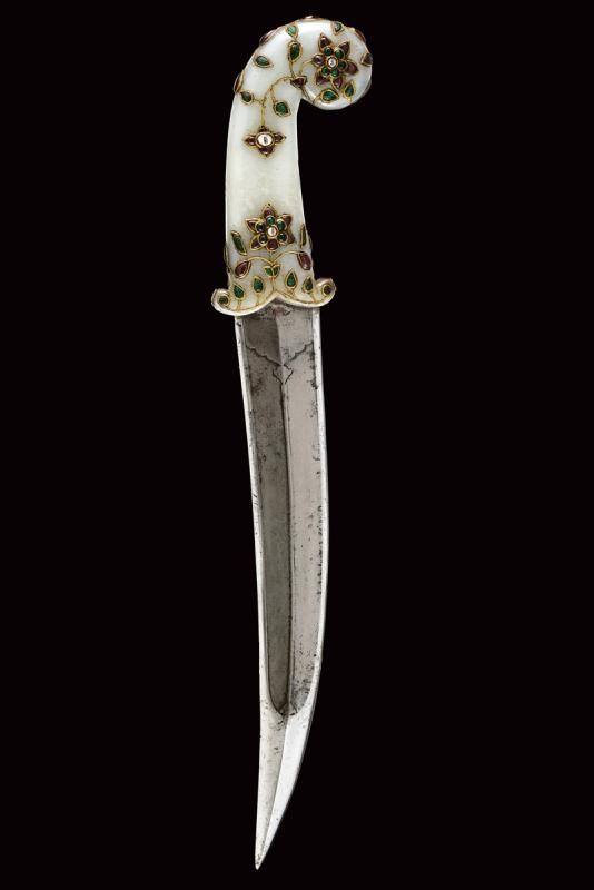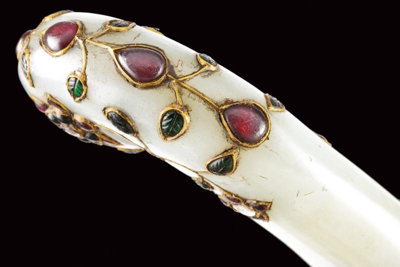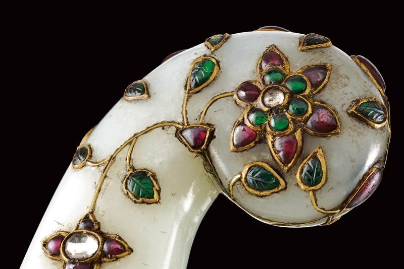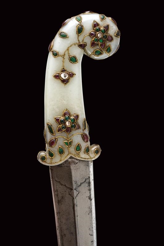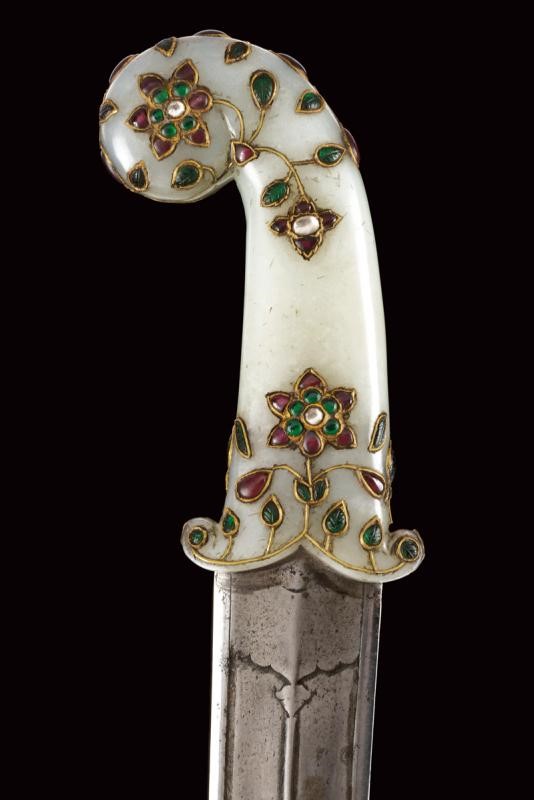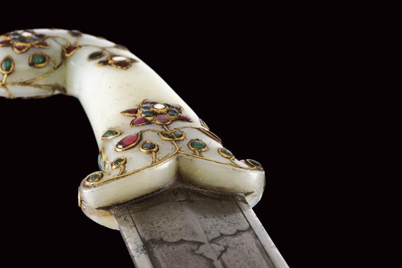 Strong, double-edged, curved, damask blade with central cannelure and carved at the base, the tip ribbed in the middle. Light jade hilt of typical shape decorated with floral motifs with gemstones (rubies, white sapphire and green paste stones (some restoration) framed in gold (kundan).