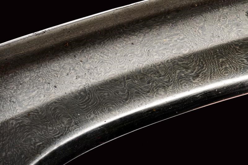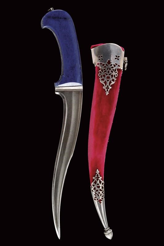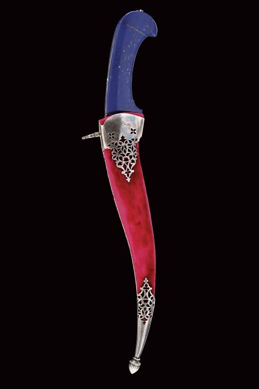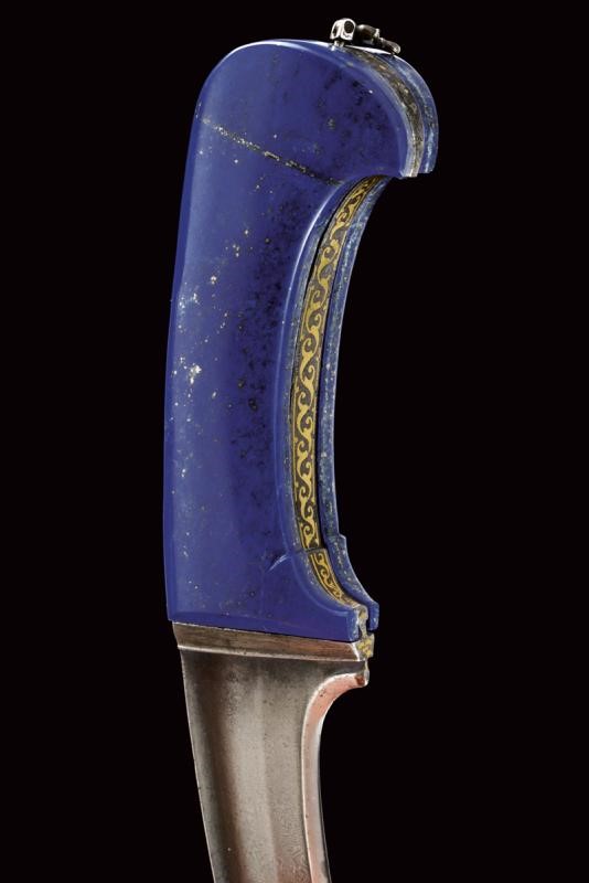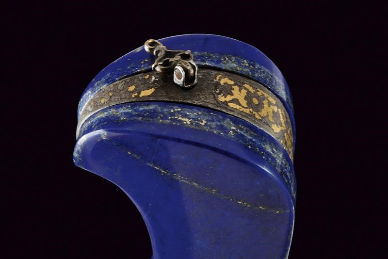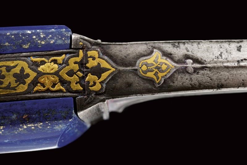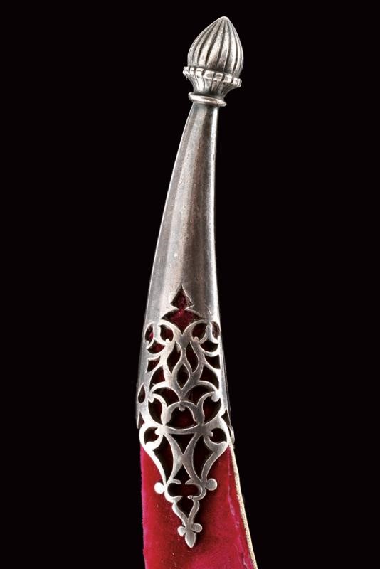 Curved, single-and-false-edged blade of fine damask, T-shaped back with fine ribbing and a carved and gilded flower at the base. Grip with lapis lazuli grip scales, wide central iron band decorated with finely gold-inlaid floral motifs and a flat surface. At the top a movable, pierced ring. Wooden scabbard covered with red velvet (partially worn and probably of later time) with pierced silver mounts. Pierced heart-shaped suspension ring.