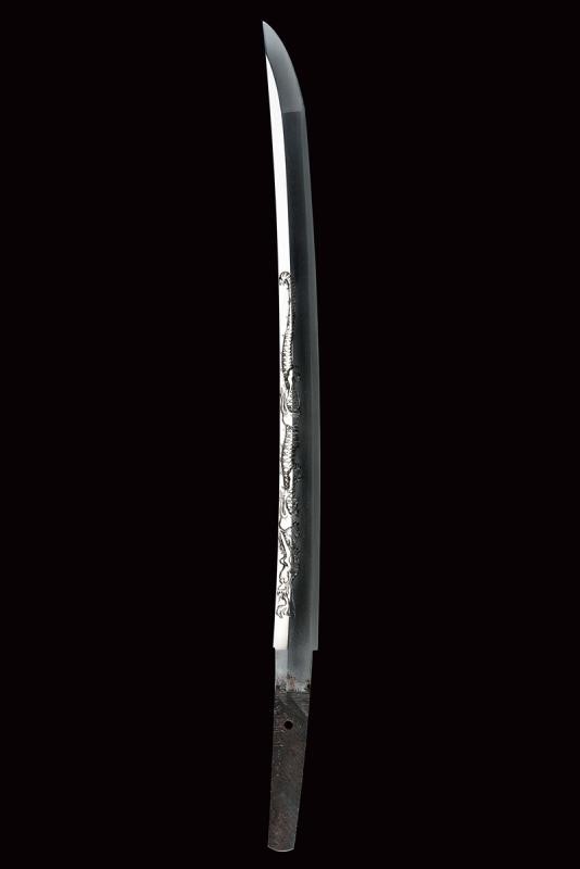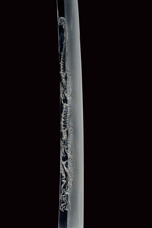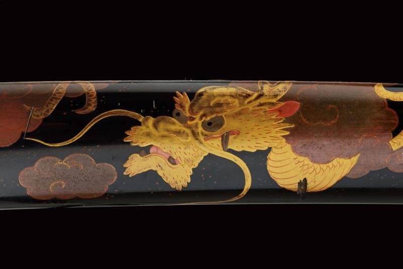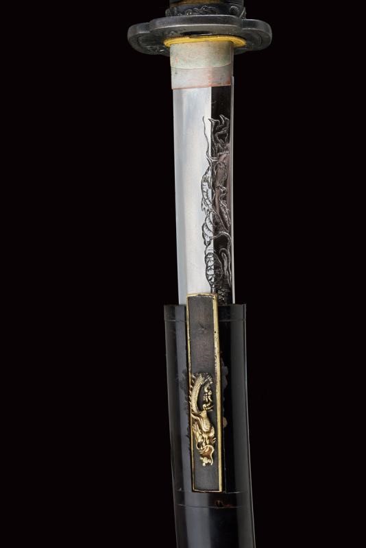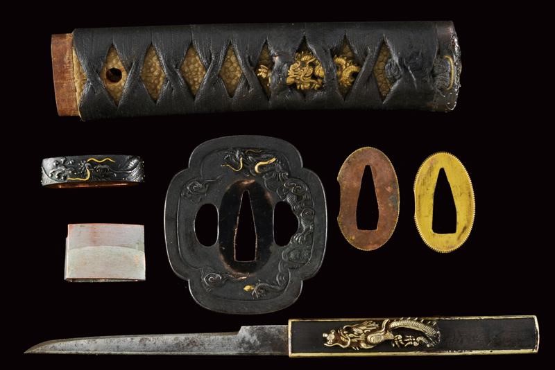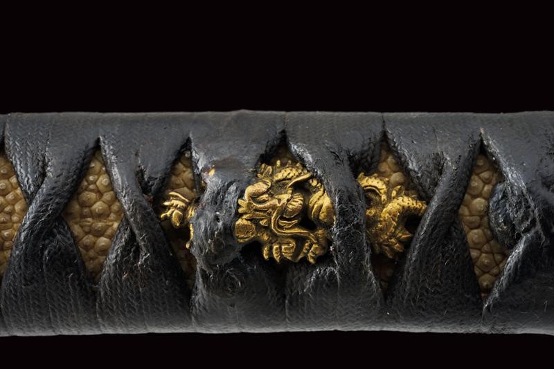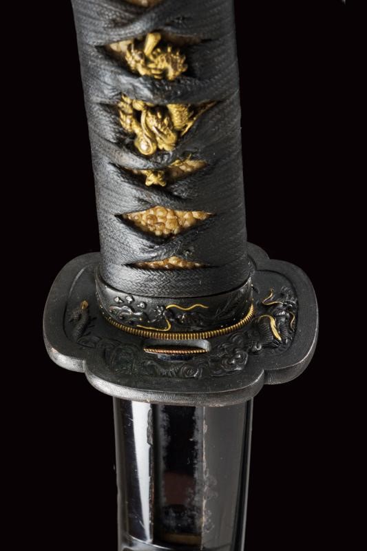 Shinogi zukuri yori mune blade. Nagasa: 41,1 cm. O-kissaki. Hada: thick ko mokume with chikei (Bizen-style manufacturing). Hamon: Suguha in thick nioi deki. Boshi: suguha ko maru kaeriyoru. Nakago: light suriage kurijiri. Yasurime: kesho o-sujikai. Horimono: kurikara ura omote (dragon). Mei: "Sakuyo Bakka-shi Hosokawa Masamori Koku-in / Bunkyu Ni-nen nigatsu-hi". (Manufactured by Hosokawa Masamori, Bakufu's servant, from the Mimasaka area). Shinshinto-Bunkyu era (1862), Hosokawa Masayoshi (Yukihide) school. In elegant koshirae with tsuba in shakudo shaped as mokko, featuring a dragon among relieved clouds. The fuchi-kashira and menuki with dragons. All the elements en suite with the blade (kurikara). The fuchi signed "Goto Seijo" (fmaybe forth generation). With a dragon also at the kozuka. Saya with a very beautiful dragon lacquered in gold and red.