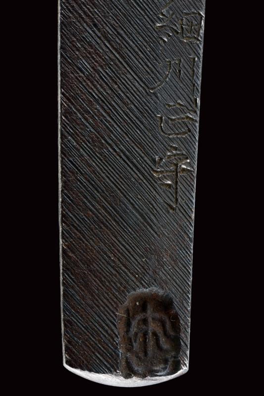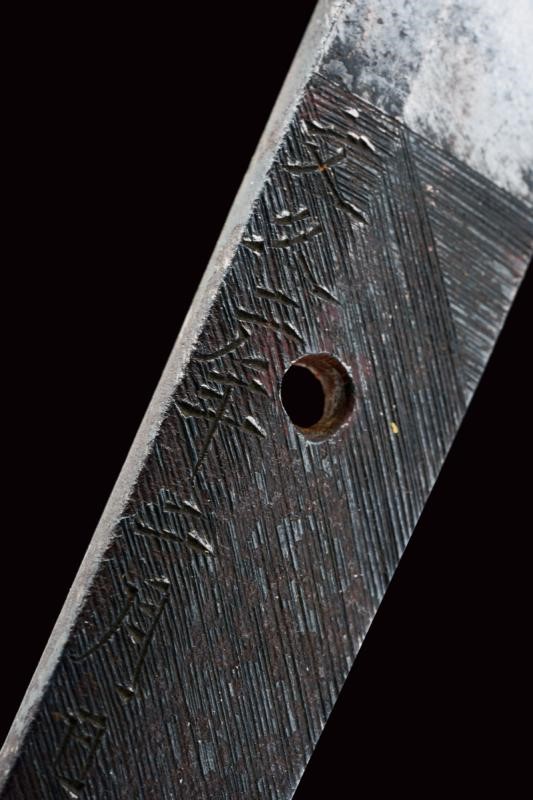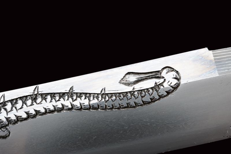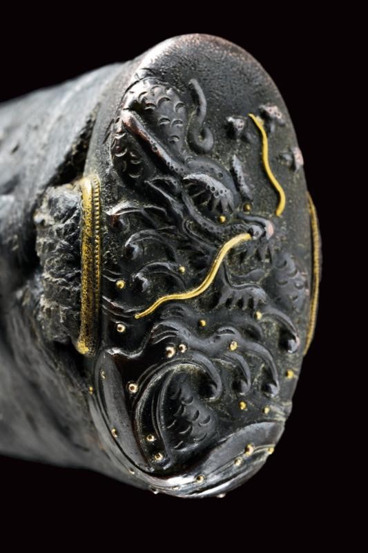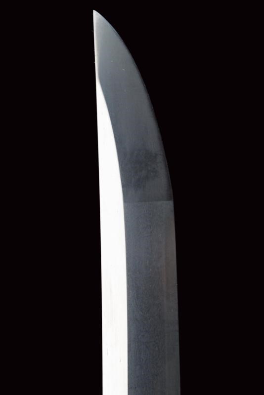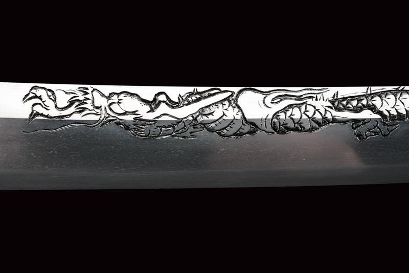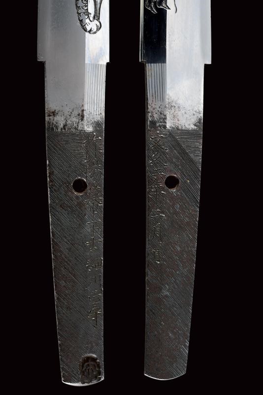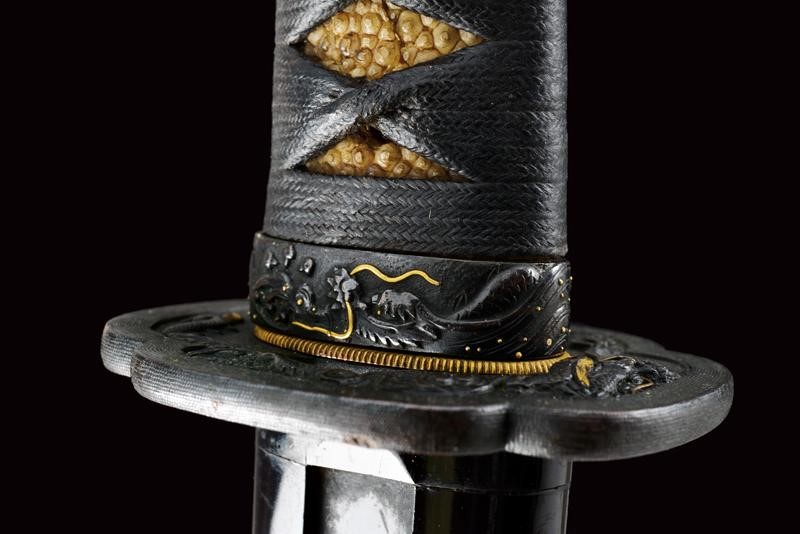 Shinogi zukuri yori mune blade. Nagasa: 41,1 cm. O-kissaki. Hada: thick ko mokume with chikei (Bizen-style manufacturing). Hamon: Suguha in thick nioi deki. Boshi: suguha ko maru kaeriyoru. Nakago: light suriage kurijiri. Yasurime: kesho o-sujikai. Horimono: kurikara ura omote (dragon). Mei: "Sakuyo Bakka-shi Hosokawa Masamori Koku-in / Bunkyu Ni-nen nigatsu-hi". (Manufactured by Hosokawa Masamori, Bakufu's servant, from the Mimasaka area). Shinshinto-Bunkyu era (1862), Hosokawa Masayoshi (Yukihide) school. In elegant koshirae with tsuba in shakudo shaped as mokko, featuring a dragon among relieved clouds. The fuchi-kashira and menuki with dragons. All the elements en suite with the blade (kurikara). The fuchi signed "Goto Seijo" (fmaybe forth generation). With a dragon also at the kozuka. Saya with a very beautiful dragon lacquered in gold and red.
