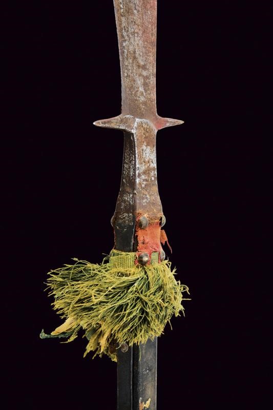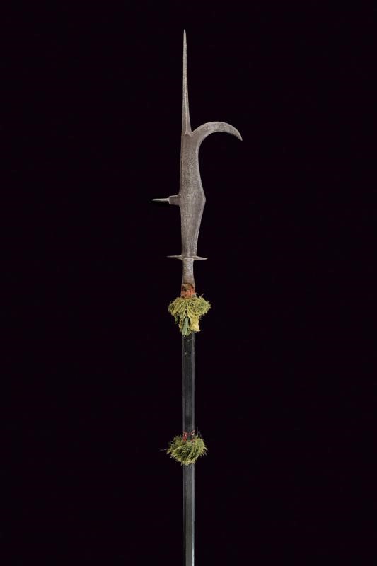 Spearhead with top cusp of lozenge section, strongly tapering upwards, sharpened hook, back rest with square base and thick squared cusp, the rests at the base are perpendicular to the blade. Ferrule with old repair and short straps. On an octagonal wooden shaft probably of early 20th century, provided with two green decorative tassels.