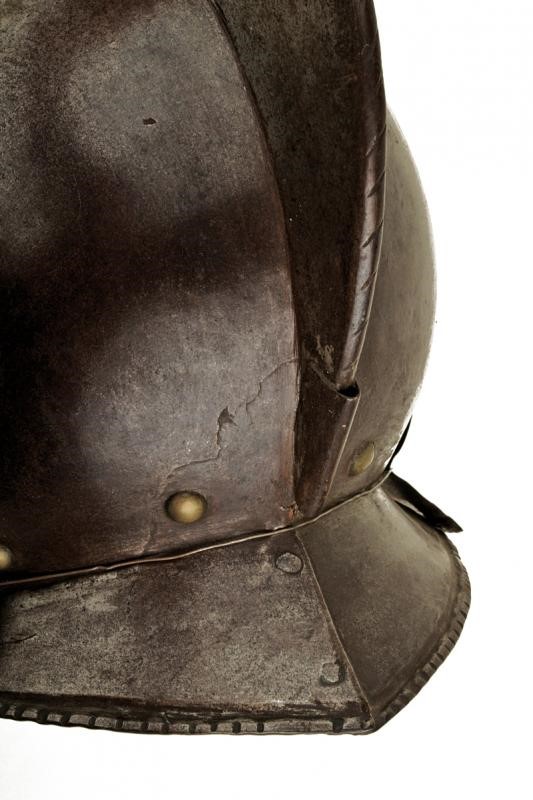 Made of iron, worked in two pieces with a medium-high comb and twisted border; pointed brim ribbed at the center, with border decorated with notches. Movable cheek-piece and neck-plate worked en suite with the brim. Row of brass rivets. Plume-holder.