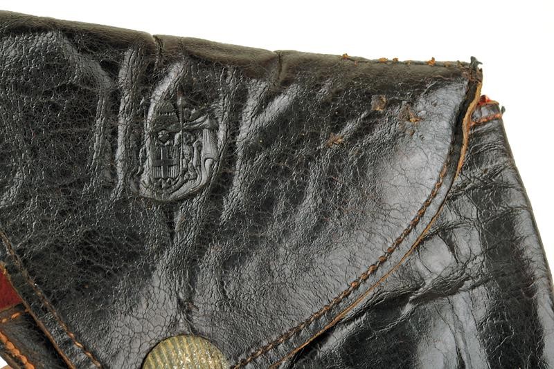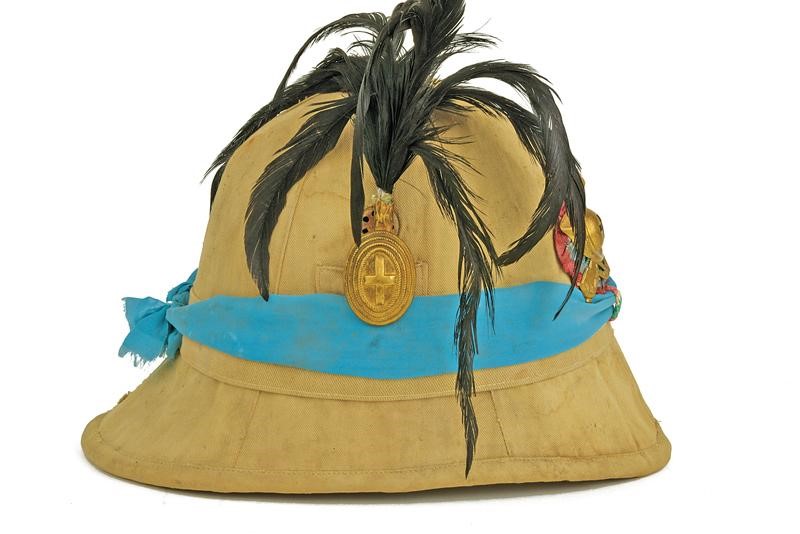 Cork body covered with cream-coloured linen, front ornament on cockade and blue band; two air holes, feather with Savoy ornament. Missing chin-strap. Brown leather sweat-band. Together with revolver holster.