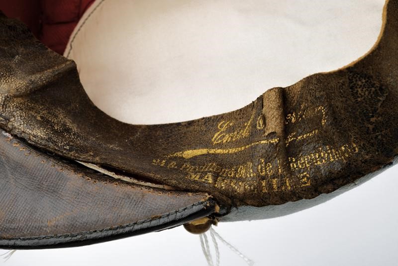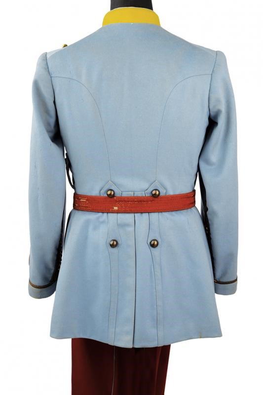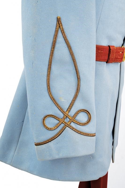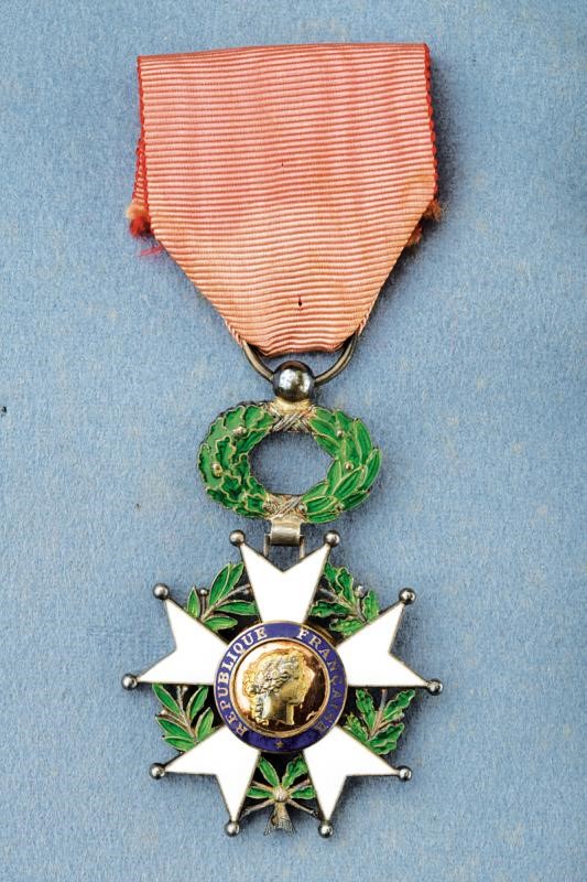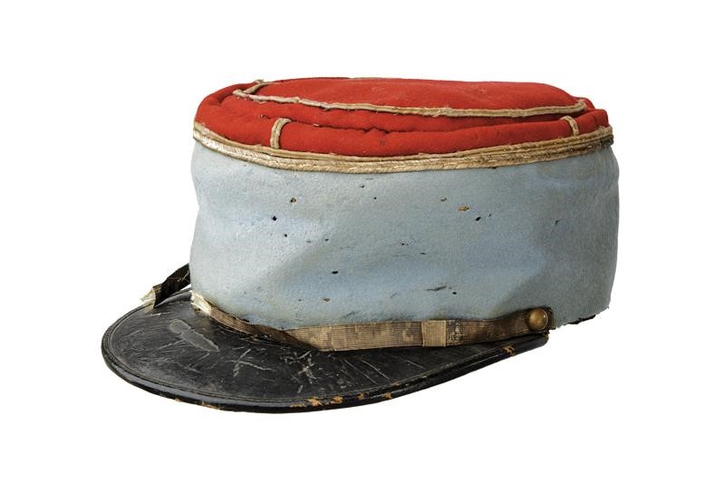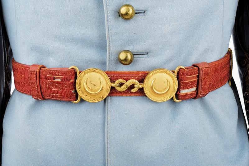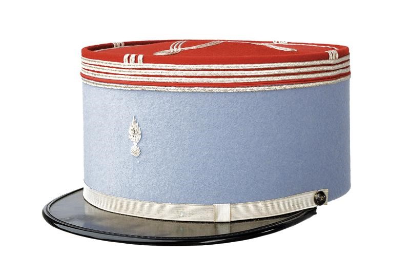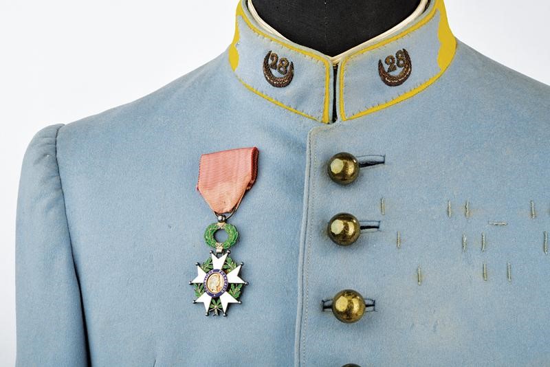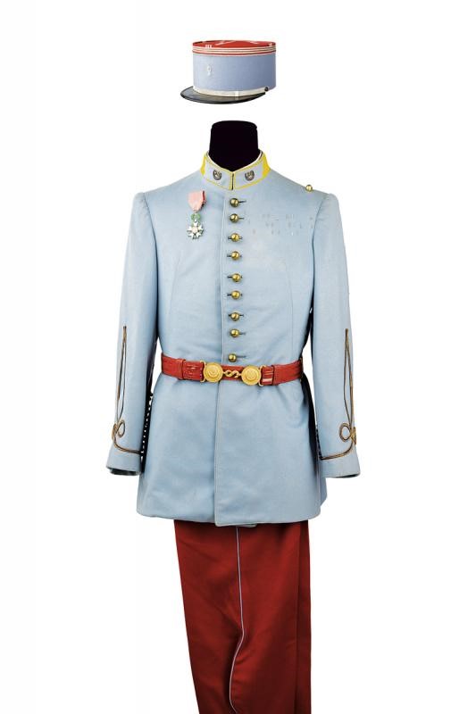 Two light blue kepi with red peak (dating back 1915 and 1945, respectively), the old one with lower rank and in poor condition. Light blue cloth jacket with yellow collar, light blue flashes with canvass regimental number surrounded by a half moon. Missing epaulette. Complete with stripes on the sleeves, spherical buttons, order buttonholes, an order of the Knight's Legion d'Honneur on the breast, 8th model. Lined in light blue cloth with a tailor's label. Red cloth trousers with light blue edging. With handwritten label 'H 792 Jamedi 15.4.39'. Complete with the rare leather belt featuring red cloth lining and gilded buckles with half-moon.