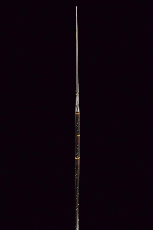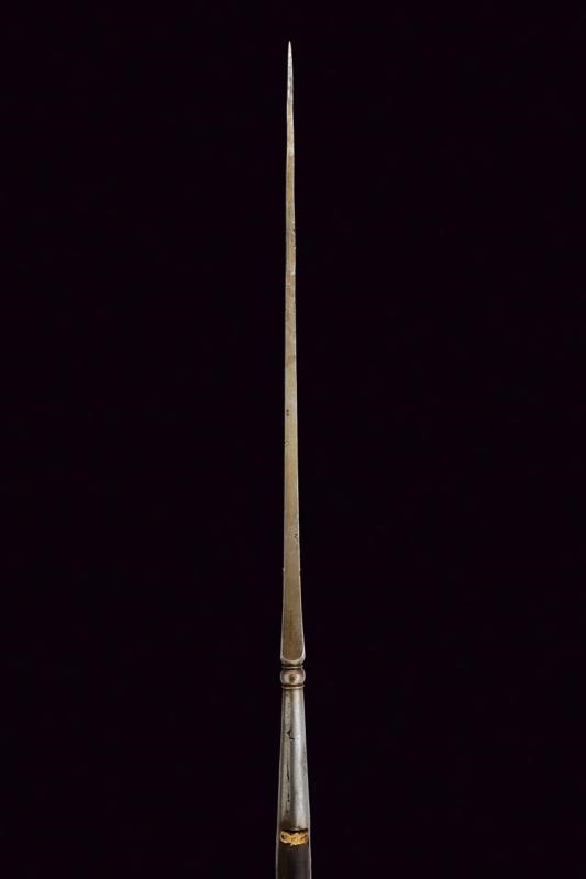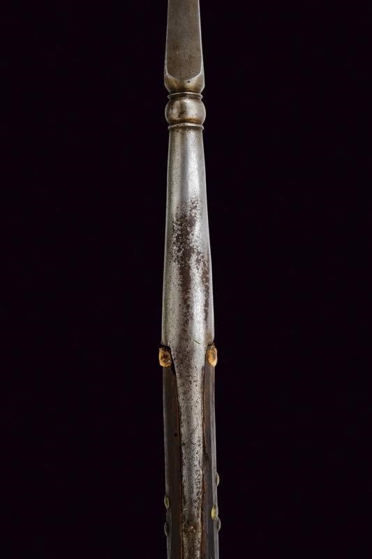 Very long cusp with spheroid knot and ferrule shaped as a truncated cone at the base. Straps of medium length. On a cylindrical wooden shaft, probably later, provided with decorative studs and with remains of tassels.