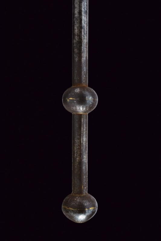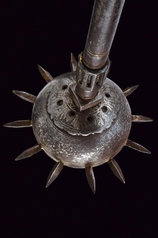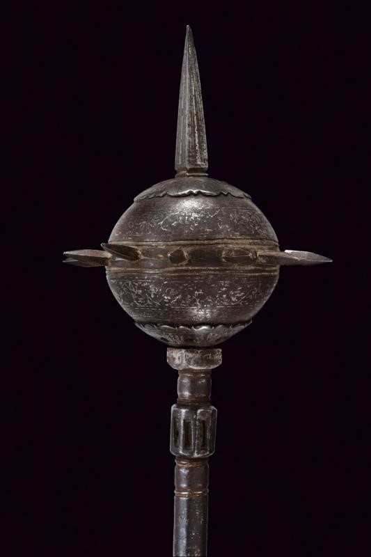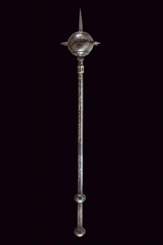 Iron spheroid head, richly decorated with remains of silver inlaying with racemes, provided with a long square cusp at the top and with a row of sharp cusps at the centre. At both sides of the globe is a raised hilt with festooned rim and inlaid en suite. Iron, cylindrical shaft provided with a lantern-shaped knot at the top. The handle is bounded by a thick spheroid knot and by the pommel.
