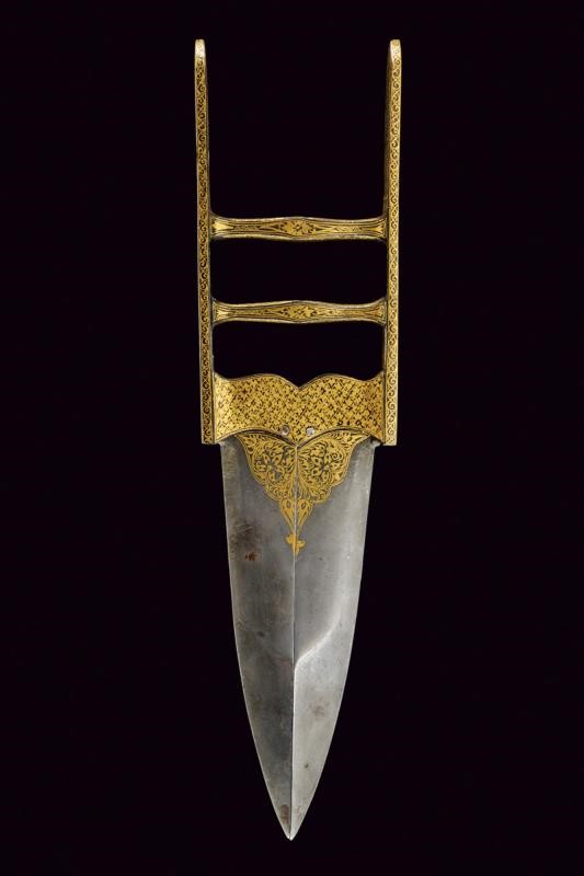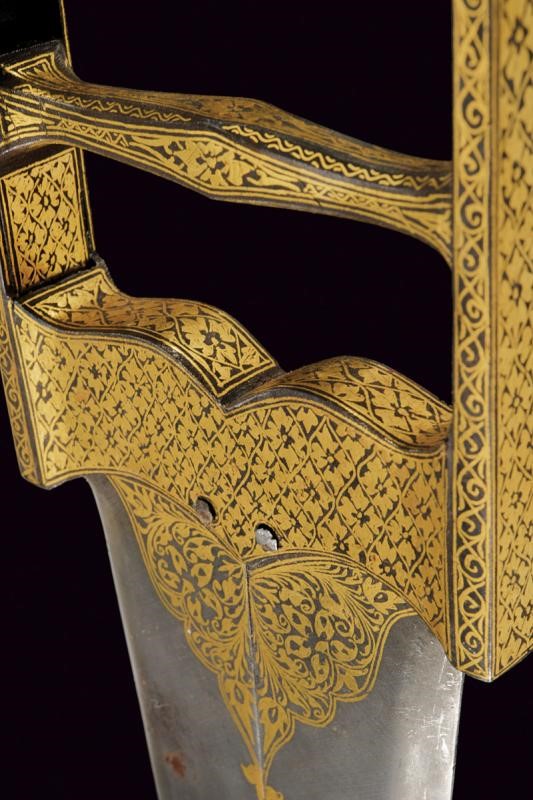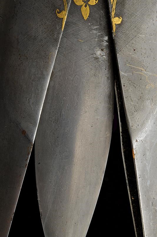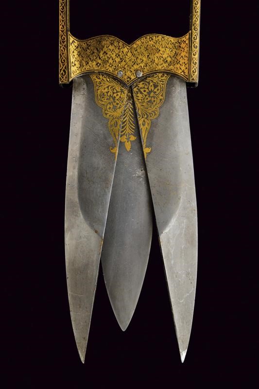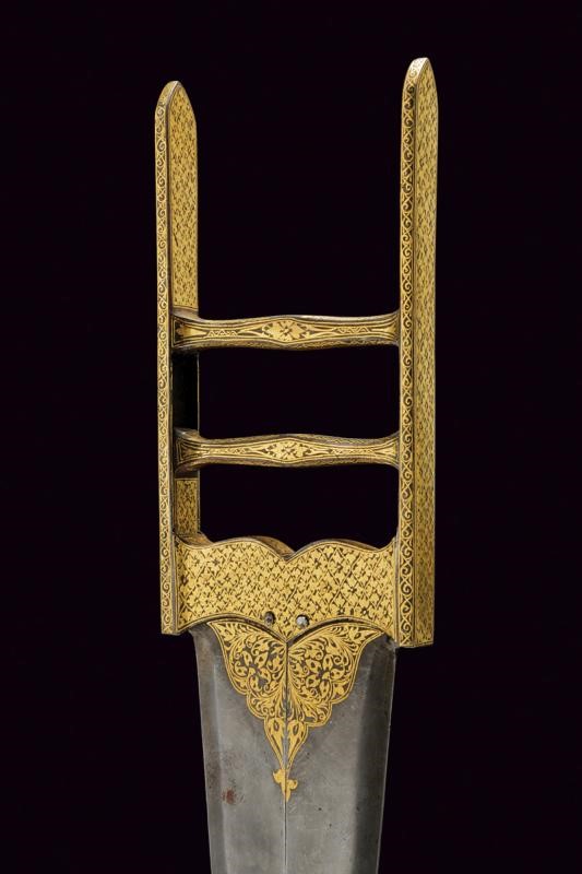 The outer blade openable in two sections; straight, double-edged blade, decorated halfway along its length with beautiful gold floral motifs. Straight, double-edged inner blade. Iron hilt, grip consisting of two crossed-bars, by pulling the movable one, the outer blade opens. Hilt completely engraved with gold floral motifs.