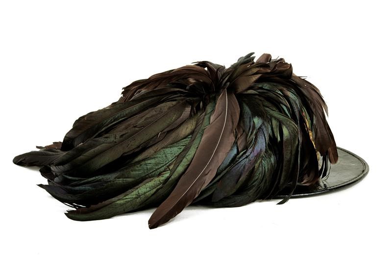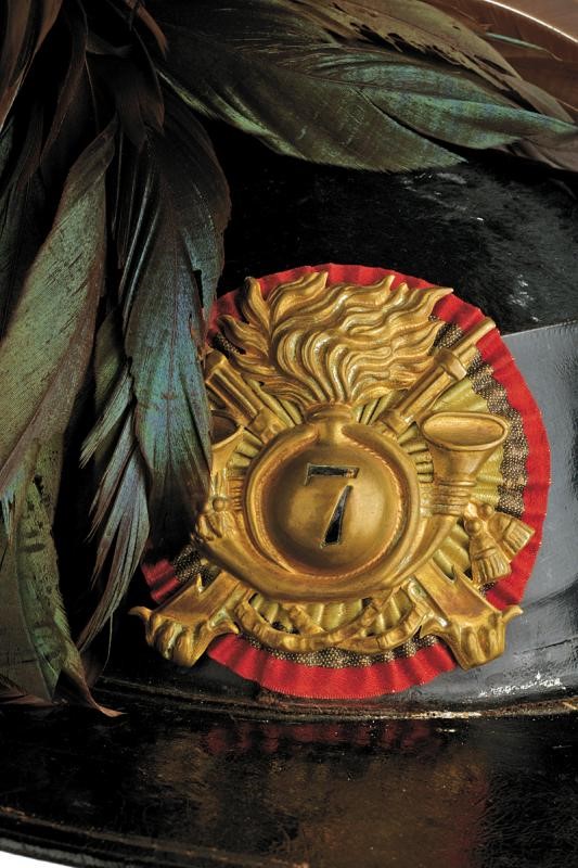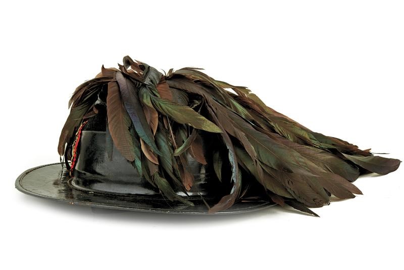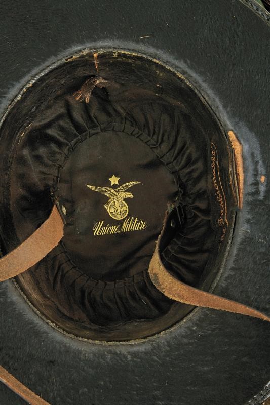 Black felt body with high leather band, beautiful gold ornament with pierced number 7, tricolour fabric cockade, wide flat leather brim, inside with sweat-band marked 'The fashionable', black silk cap marked 'Unione Militare'. Complete with chin-strap and beautiful feathers. Some signs of use and time. Rare.
