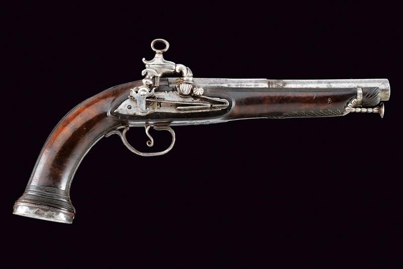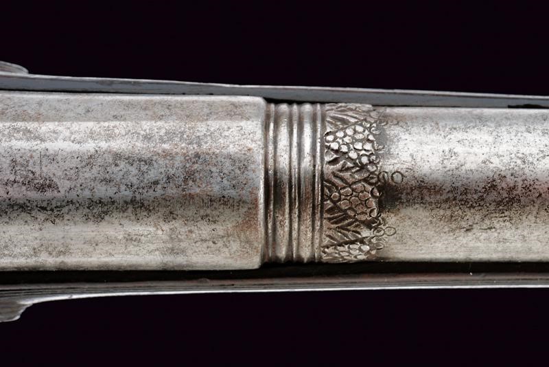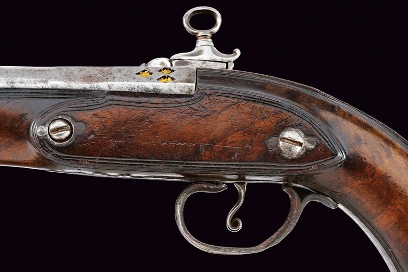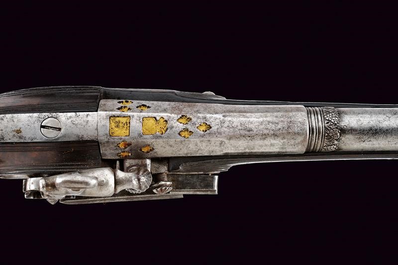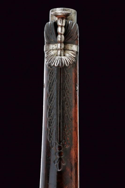 Smoothbore, three-stage, 17 mm cal. barrel, octagonal at the first part with two marks among nine gold-inlaid lilies, one of the marks with monogram "VA", followed by a short, sixteen-faceted segment, then round after two rings with leaves, long smooth tang. Miquelet lock finely converted to percussion keeping the original cock. Carved, wooden full stock sculpted with floral and geometric motifs, partially carved iron mounts; iron ramrod.