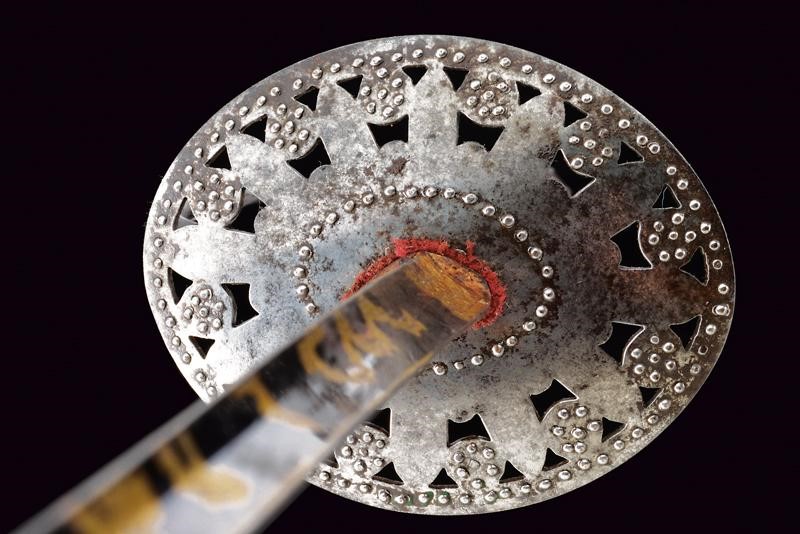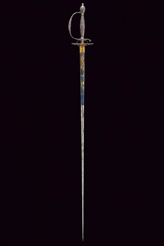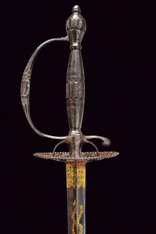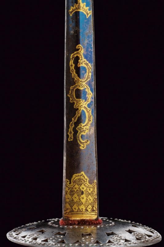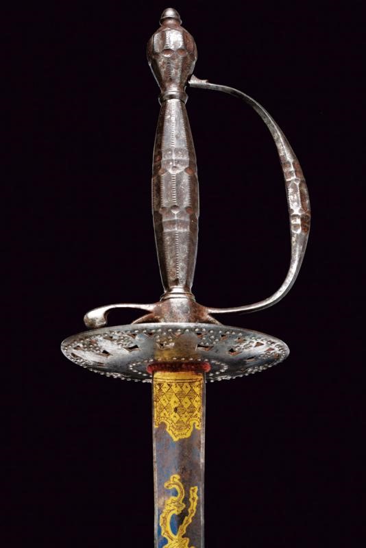 Straight blade of triangular section with hollow sides, the base engraved and gilded on a blue background with floral and geometric motifs. Steel hilt, valve of elliptical shape, pierced with flowers and decorated on the inside with innumerable steel beads; the center of crossguard with two small arches; grip, pommel and loop-guard with geometric carvings. Remains of original bluing.