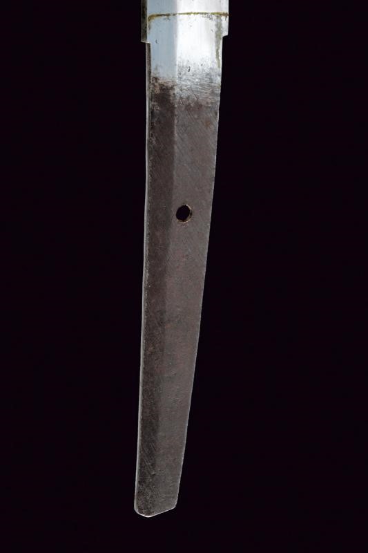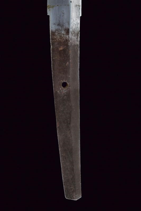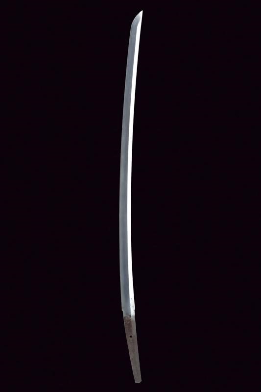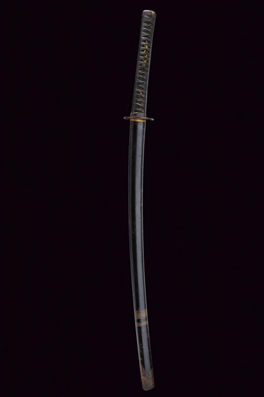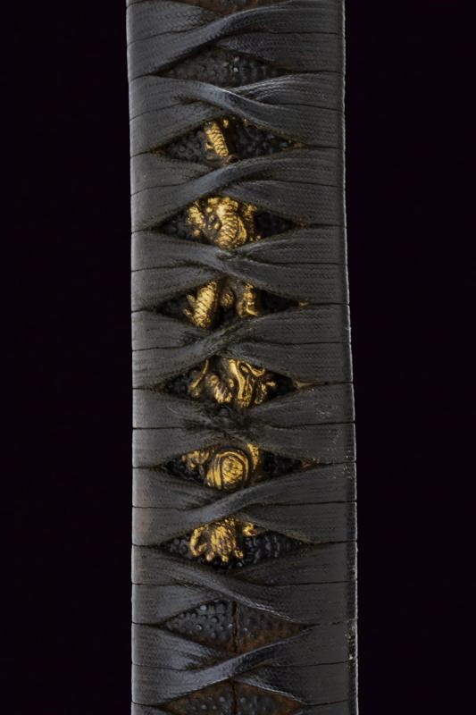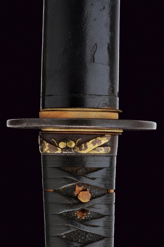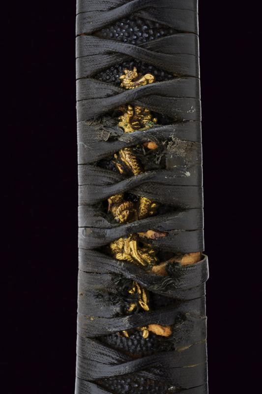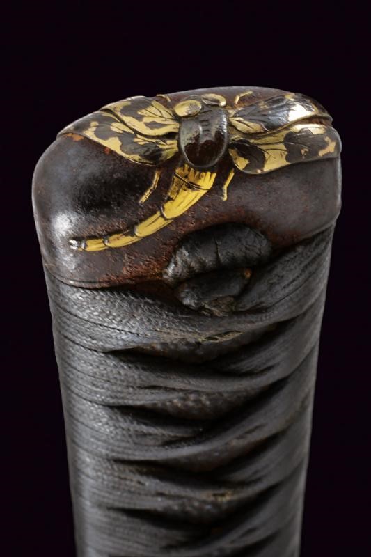 Shinogi-zukuri blade, Iori-mune. Nagasa: 70.3 cm. Partially visible Hamon and Hada. Some non-serious kizu. Nakago-jiri: Iriyamagata. Mumei. One Mekugi-ana. Copper habaki with remains of gilding. In koshirae with Edo-period iron tsuba maru-gata with remains of gilded inlays. Iron Fuchi and Kabutogane with a beautiful Takabori-type decoration in relief with partially gilded dragonflies. Tsuka of apparently not recent production with gilded dragon Menuki, Same made of black dyed ray skin, Tsuka-ito made of black silk (some damage). A non-pertinent, wooden seppa. Old iron saya with defects and restorations, partly worked like the iron mounts typical of the Handachi Saya.