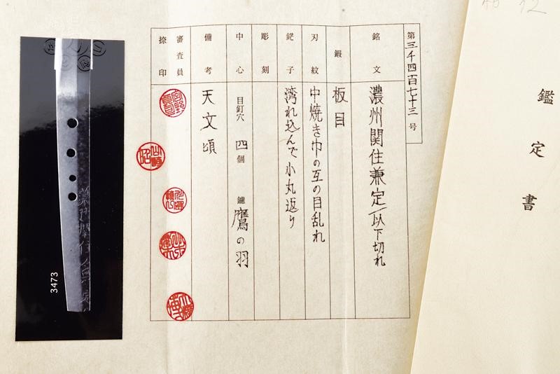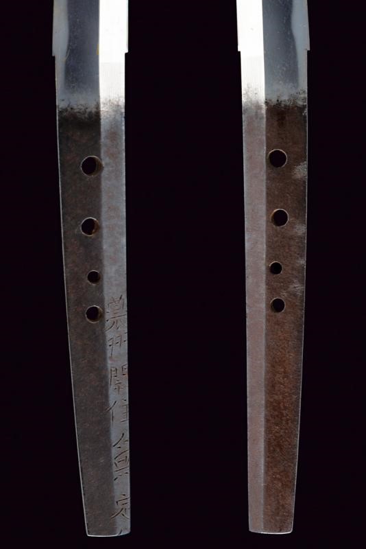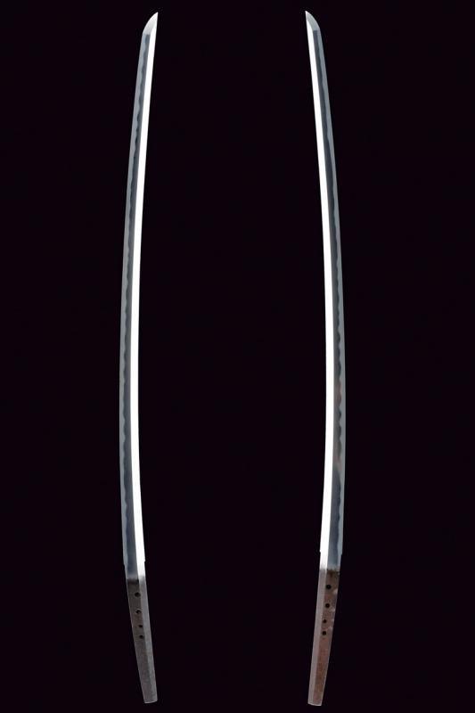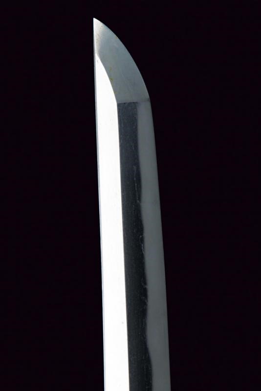 Slim and elegant Shinogi-zukuri blade, Iori-mune. Nagasa: 70,4 cm. Clearly visible Hamon and hada. Nakago-Osuriage. Jiri: Kiri. Mei: Noshu Seki ju Kanesada saku. Four Mekugi-ana. Late Muromachi period, 16th century. Silver-rolled habaki. In Shirasaya.