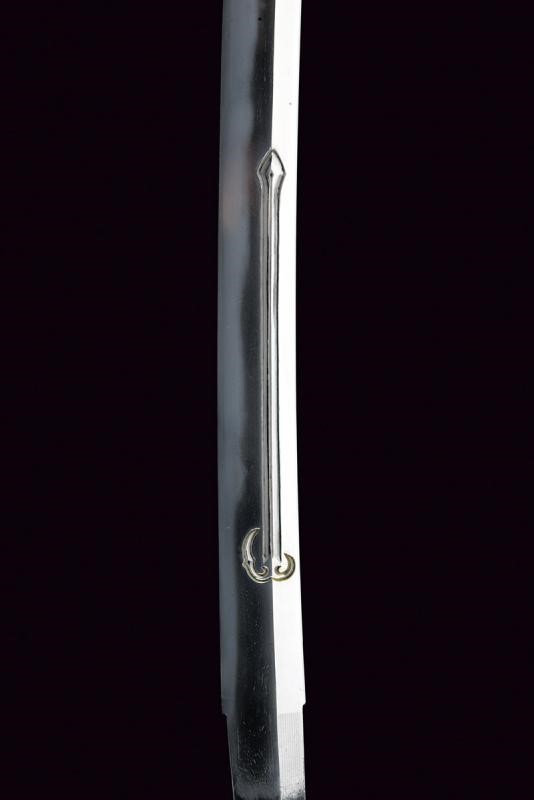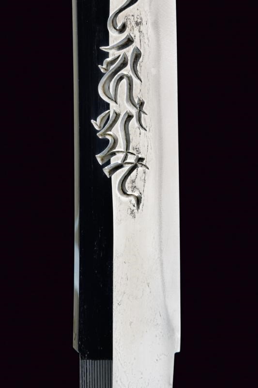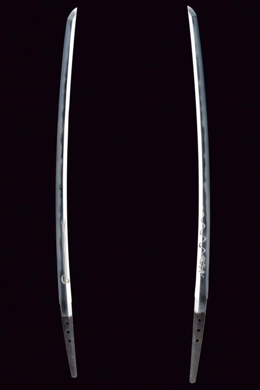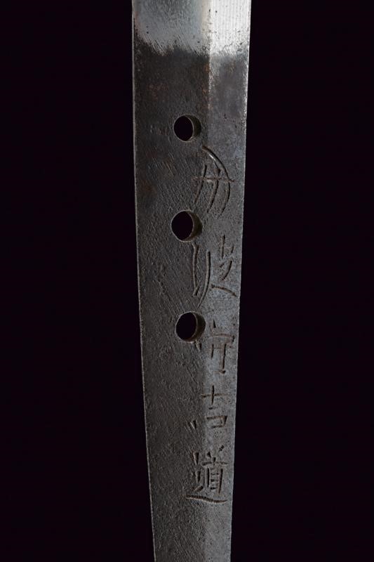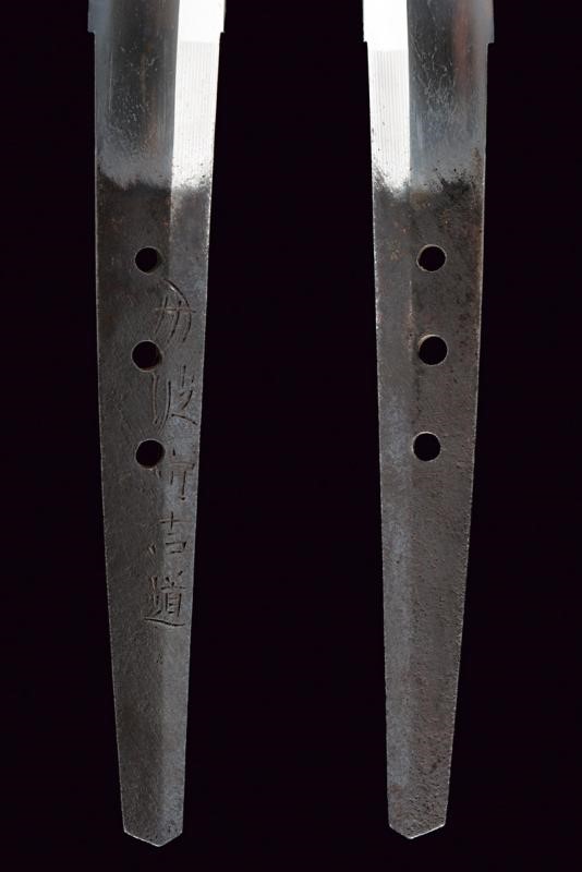 Shinogi-zukuri blade, Iori-mune. Nagasa: 66.7 cm. Clearly visible Hamon and hada. Two Horimono: with Ken and characters. Nakago-jiri: Iriyamagata. Mei: Tanba no Kami Yoshimichi (maybe gimei, not true). Shinto era, 17th century. Three Mekugi-ana. Gilded-metal habaki. In Shirasaya.
