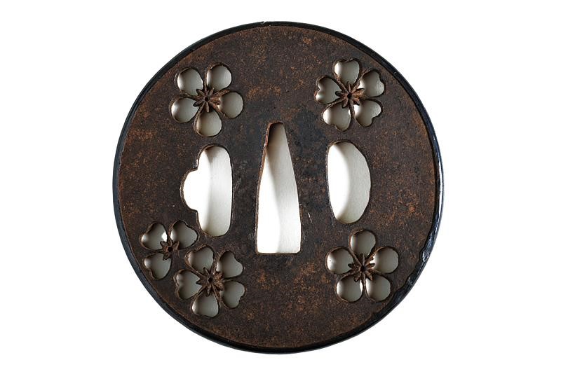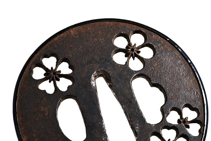 Made of iron, Maru-gata, with cherry blossom open-work. The border covered with a shakudo band. Nakago-hitsu-ana 2,9 cm. Kept in Kiri-box. Probably late Edo period, mid-19th century.