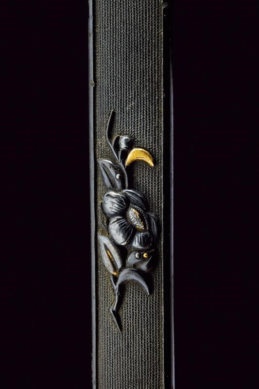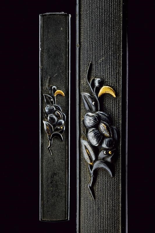 Made of shakudo-type metal with Nanako decoration on the front side. With a floral effigy in relief at the center, featuring gilded elements. In Kiri-box.