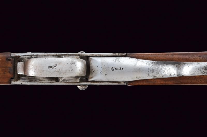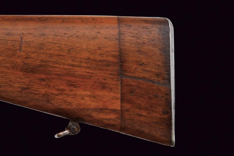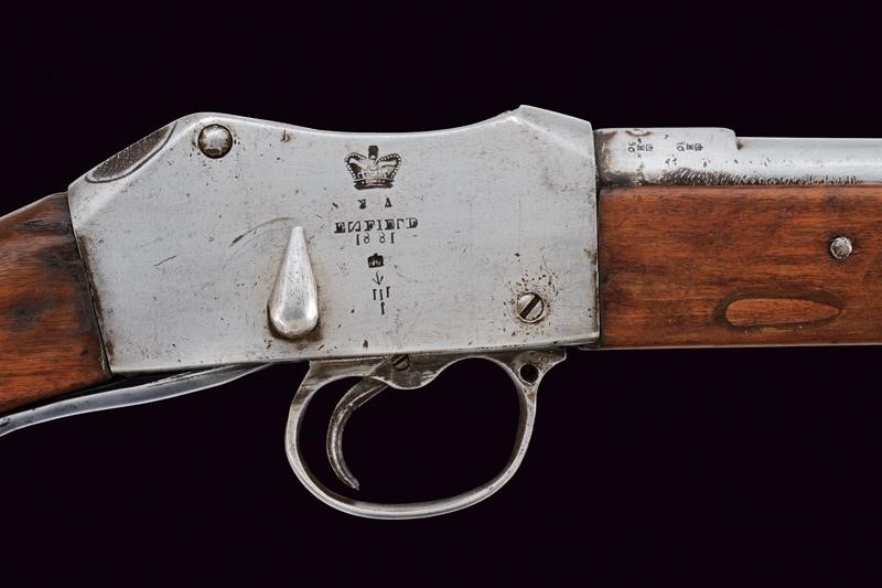 Round, rifled (bore with slight pitting, clearly visible rifling), 10.4 mm cal barrel, octagonal at the base base, with various English marks, adjustable and foldaway rear sight and sight, cal; Martini bolt, smooth frame marked "ENFIELD 1881" with crown and various markings (a beautiful manufacture from Afghanistan/ Khyber Pass). Wooden butt and fore-end, the butt is lengthened. Iron mounts and ramrod.