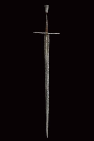 Double-edged blade, grooved at the first part, then slightly ribbed, the outline of the coat of arms under a round cartouche is still clearly visible on the right side. Straight quillon of rectangular section. Pommel shaped as a truncated cone, enlarged and well pronounced at the upper part.