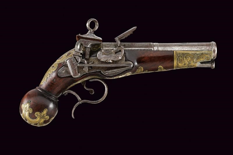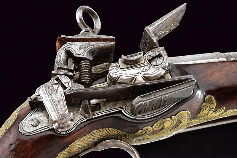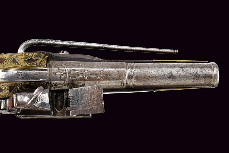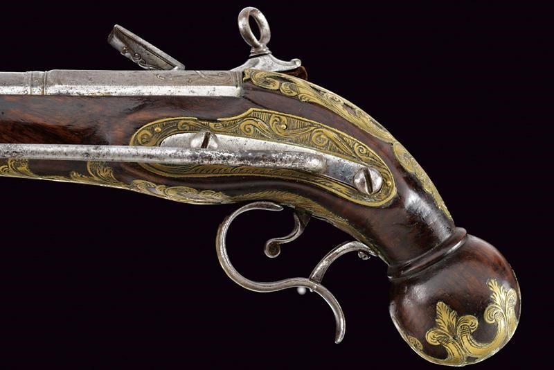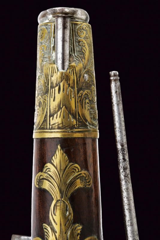 Smoothbore, two-stage, 16 mm cal. barrel, the first part octagonal with silver-inlaid engravings (small missing parts), double ring at the girdle, one smooth the other beaded, after round with moulded muzzle; curved tang with engraved borders. Miquelet lock finely engraved and carved. Wooden stock (small crack) with typical, spherical pommel. Brass mounts partially pierced, engraved and inlaid with floral motifs, iron trigger guard with finger support and brass-inlaid decoration. Iron belt hook and ramrod.