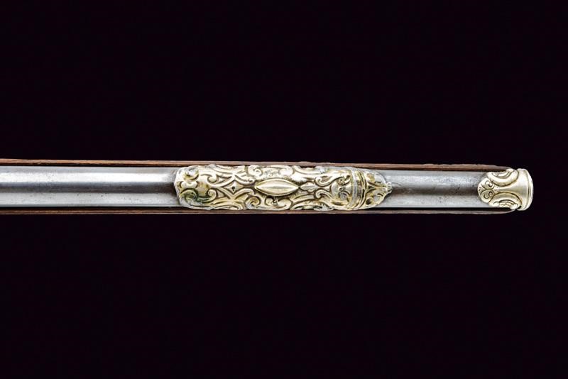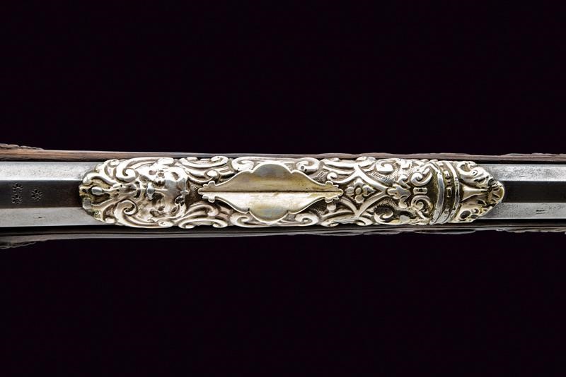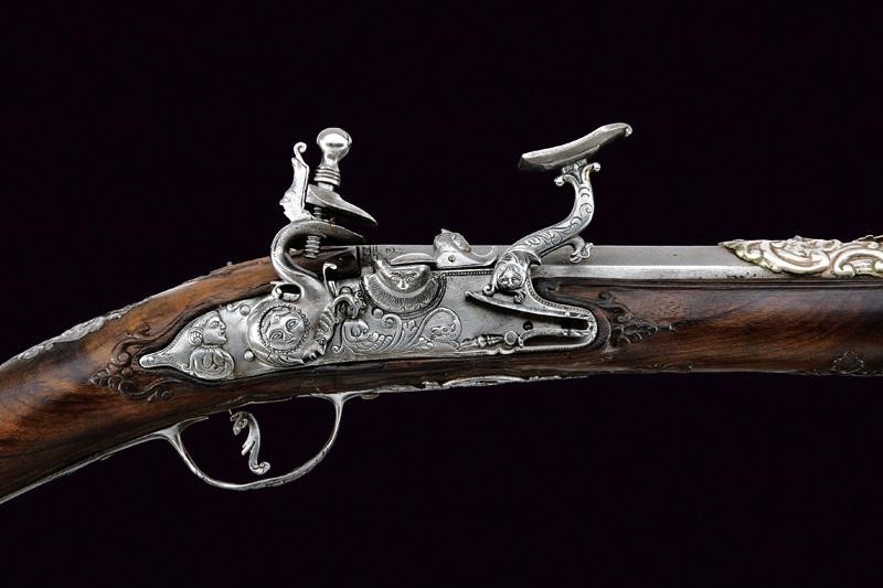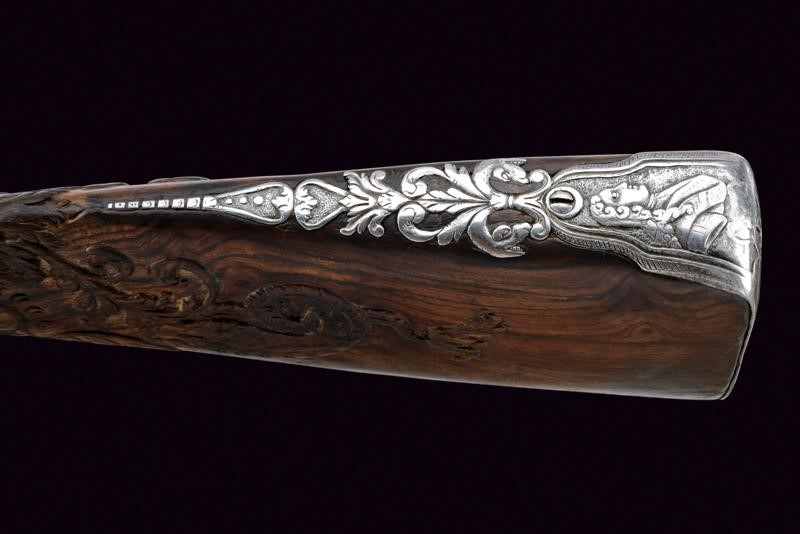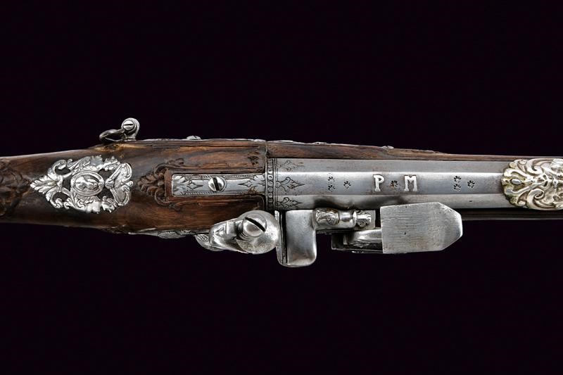 Smoothbore, two-stage, 13.5 mm cal. barrel, octagonal at the first part decorated with a frame and three lilies, marked 'PM' in silver among stars, then round after smooth and beaded rings.The barrel is decorated with three silver mounts decorated with floral motifs, the first with sight and decorated with a mask, at the girdle a silver ring surmounted by a silver lily; engraved tang. Beautiful lock richly sculpted with busts, snakes, masks and floral motifs in relief, movable pan cover, signed "Marco Antonio Corsini" inside. Briarwood full stock (restorations under the lock and under the first part of the barrel), sculpted with busts, snakes and floral motifs over the entire length and with a large dragon on the butt, beautiful steel mounts richly carved, engraved and partially pierced, the counterplate with two angels holding a medallion with a bust, the trigger guard with a bust and a grotesque face, the tang with snakes and floral motifs, the butt plate with a male bust and with snakes and floral motifs below, a medallion with a bust held by two grotesque figures on the back. Iron-tipped wooden ramrod.