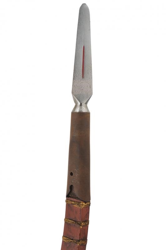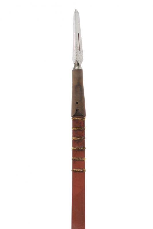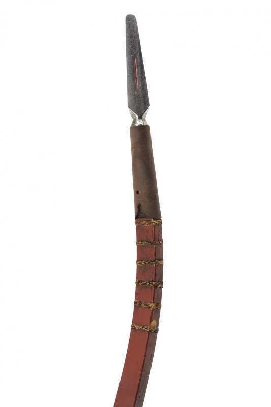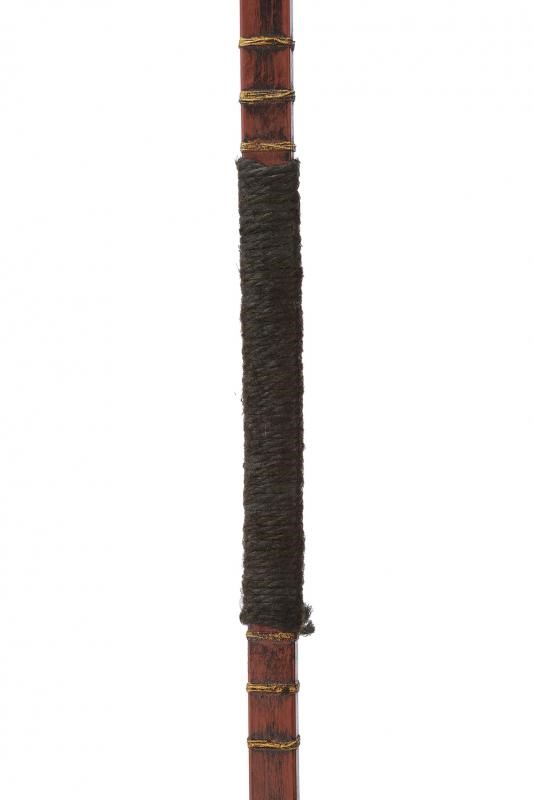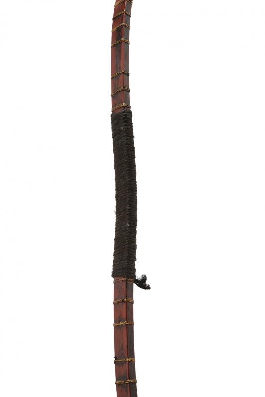 Bow with counter-curved wooden frame, of parallelepiped section. Dyed red, provided with bundles of gilded ropes and with a brown rope grip. The cusp of a fukuro-yari is mounted at both ends and held by a mekugi. Both cusps provided with saya. Period: probably late Edo period, mid-19th century.