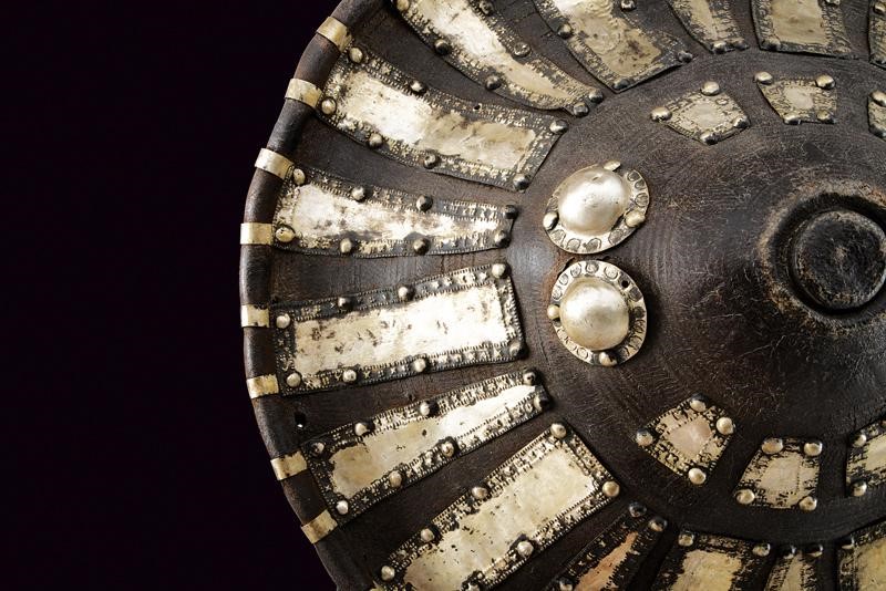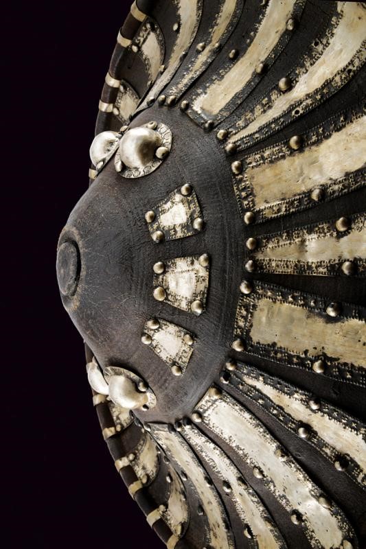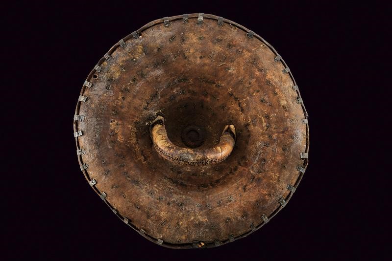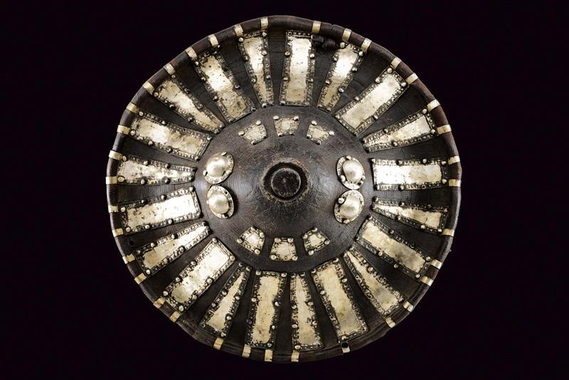Made of sturdy leather, round, with strongly raised centre and raised edge; the surface richly adorned with beautiful mounts made of silver foil and studs. With leather handle inside.
