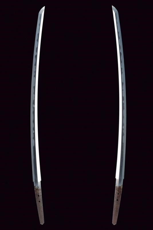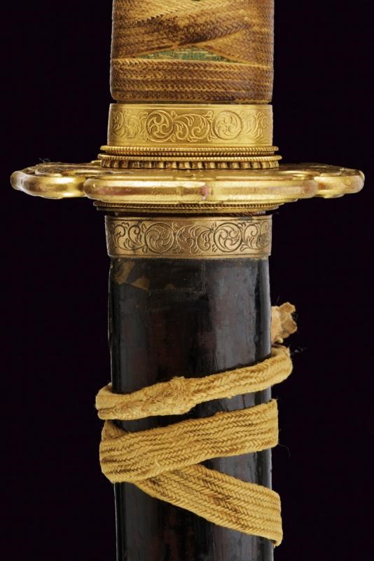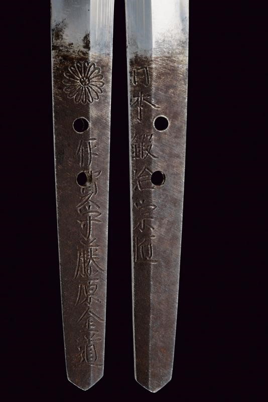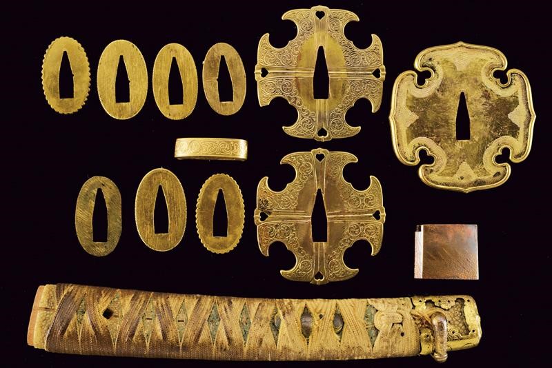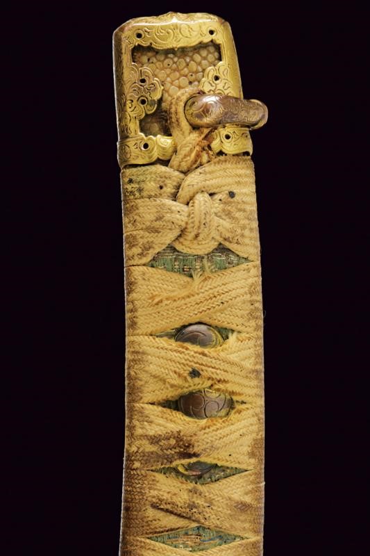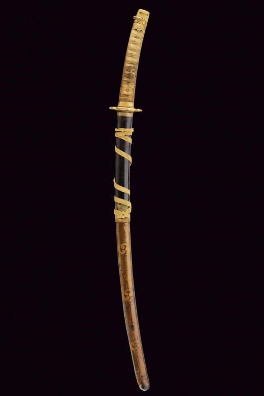 Shinogi-zukuri blade, Iori-mune. Nagasa: 64 cm. Clearly visible Hamon and hada. Nakago-jiri: Kengyo-jiri. Mei: Iga no Kami Fujiwara Kinmichi, Nihon Kaji Sosho (sandai). Two Mekugi-ana. Late 17th/early 18th century, Shinto period. Copper habaki. In koshirae of Edo period with Tsuba Aoi-gata with fretworked Inome and engraved Tomoe-mon. Gilded Fuchi and Kabutogane engraved en suite with Tomoe-mon, gilded tsuba. Menuki with Tomoe-mon. Antique Same and Tsuka-ito with signs of use and time. Saya worked en suite (perhaps the Kojiri is missing), the Koiguchi en suite with the other mounts, lacquer (missing parts and signs of time) with gilded Tomoe-mon. Keeps part of the original lacing with mounts featuring the same Mon.