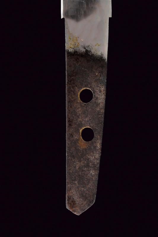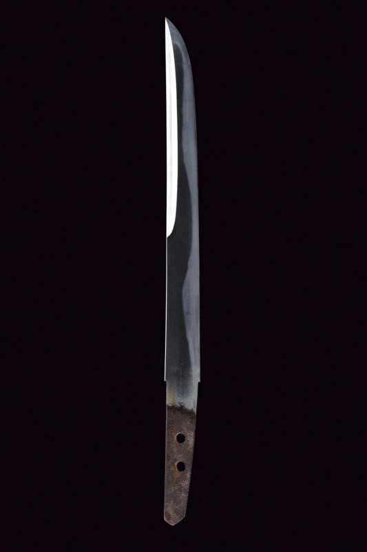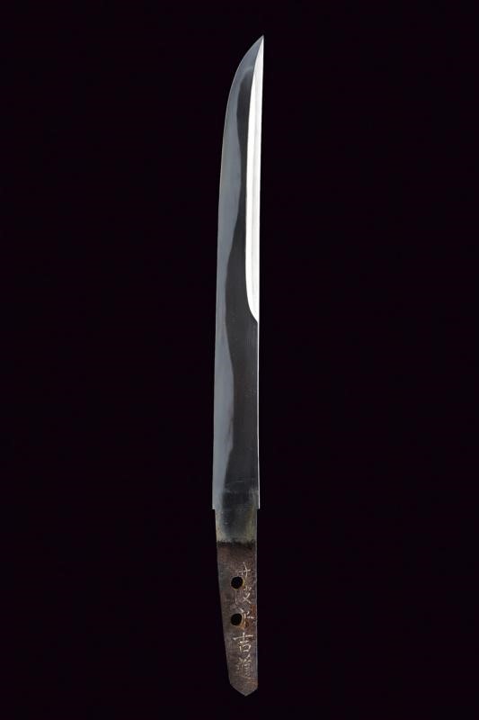 Single-edged Kanmuri-otoshi blade. Iori-mune base. The tapered part of the back with no edge. Nagasa: 18,4 cm. Visible Hamon and hada. Mei: Tanba no Kami Yoshimichi. Shinshinto era, late 18th-early 19th century. Silver-rolled habaki. In Koshirae of Edo period, Aikuchi type with brass mounts worked with bamboo leaves. The saya worked en suite.