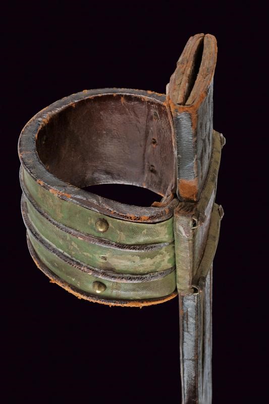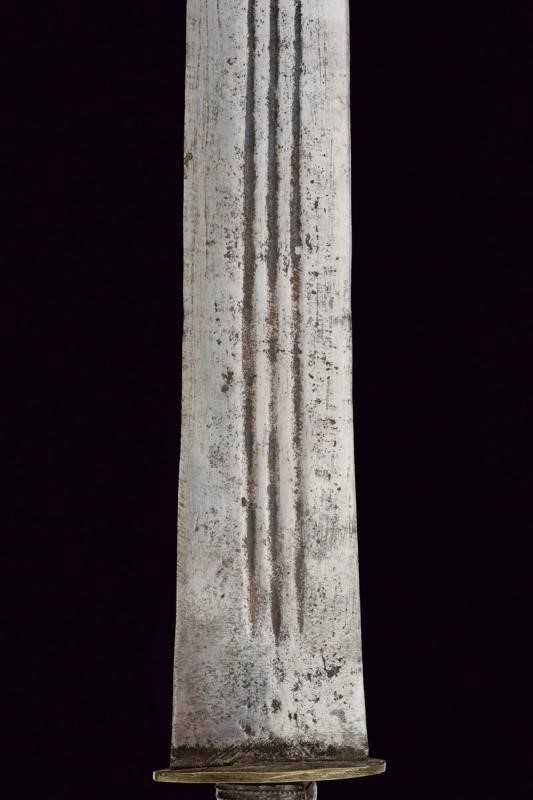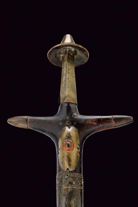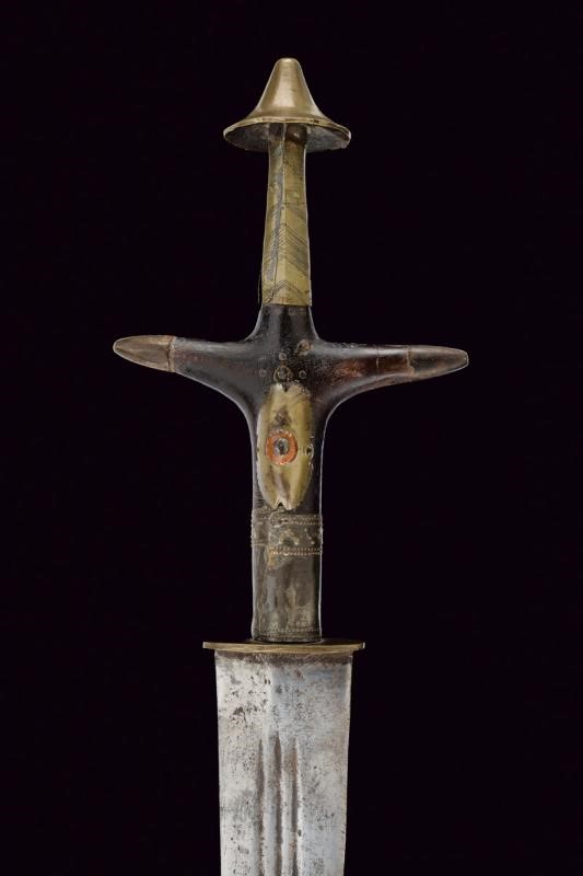 Wide, double-edged straight blade with triple groove, typical cross-shaped wooden grip, mounts of various metals. Complete with leather scabbard with metal mounts and arm ring.