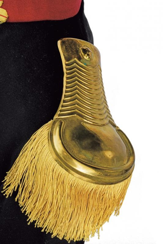 Composed of kepi with service pompom and feather. Jacket with honour cords. Metal epaulettes with fringes. Light blue trousers with band. Belt complete with cartridge box, belt frog with scabbard (numbered 11223), containing bayonet (numbered 77). All in good condition, with minimal signs of use and time. Interesting and uncommon.
