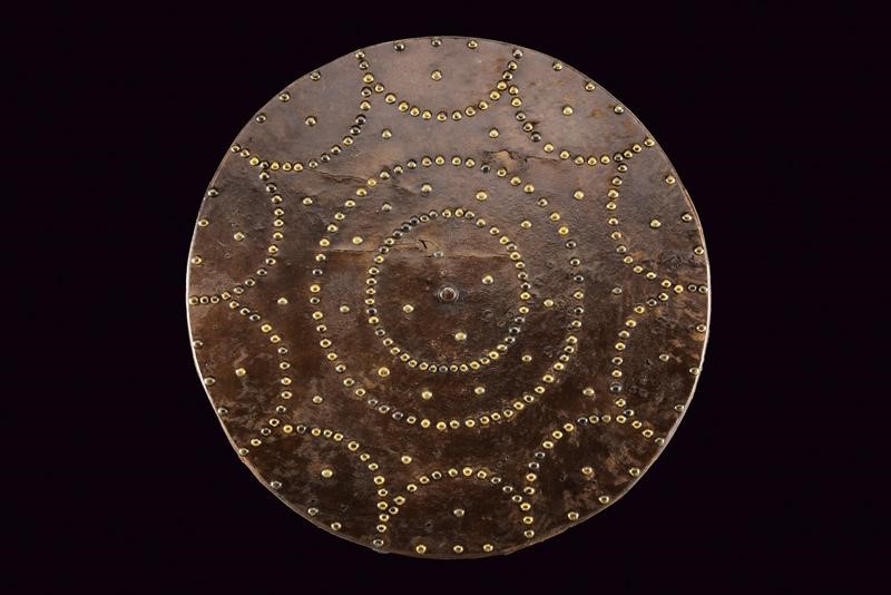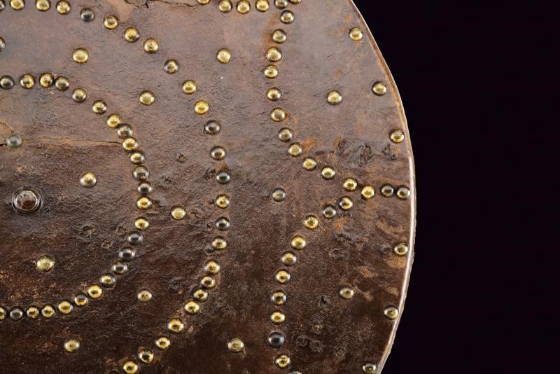 Of round shape, made of wood, the entire external surface covered with leather and decorated with various round and semicircle rivets (small damages and missing). The rear part featuring four wooden boards, with some engravings at the centre, the letter 'X' and collection number '359'. Few remains of the leather handles with three iron rivets on each edge.
