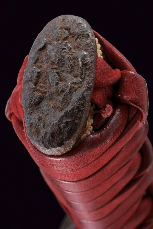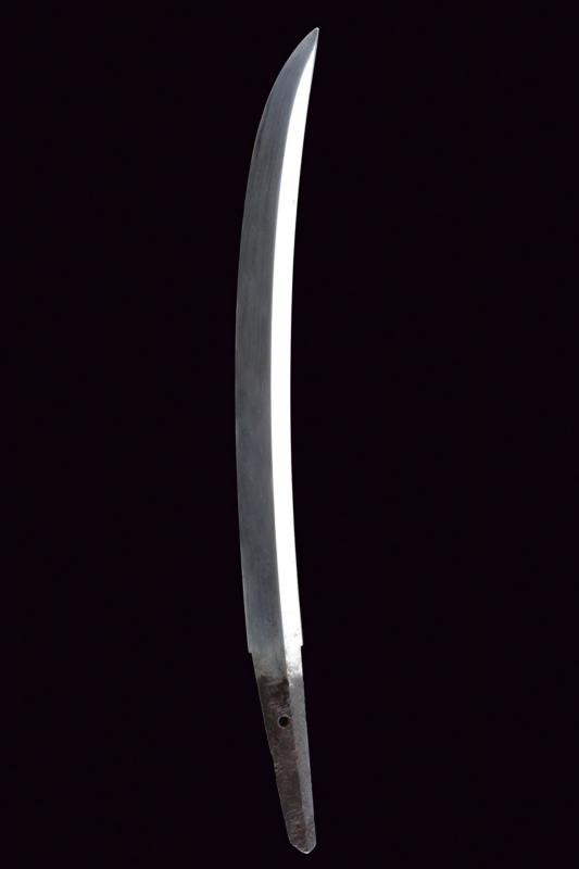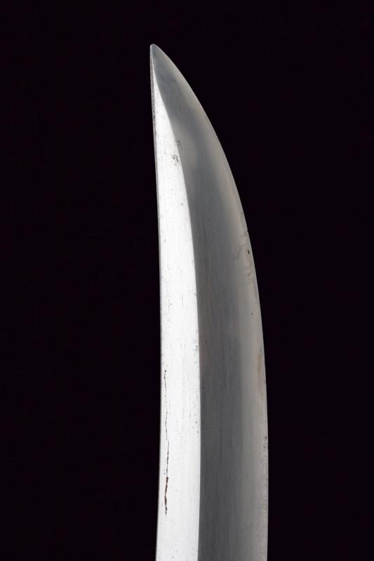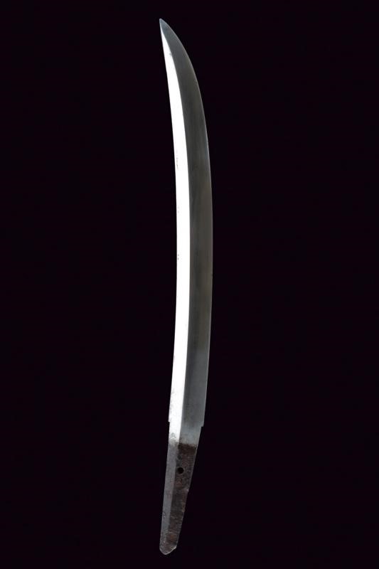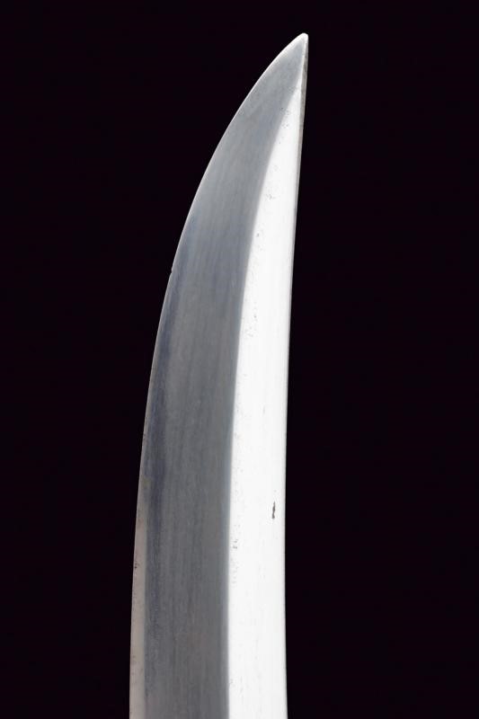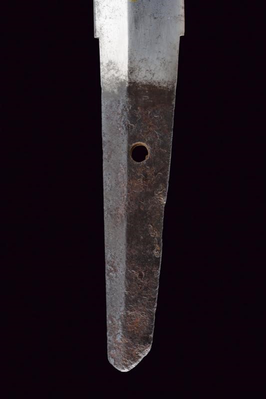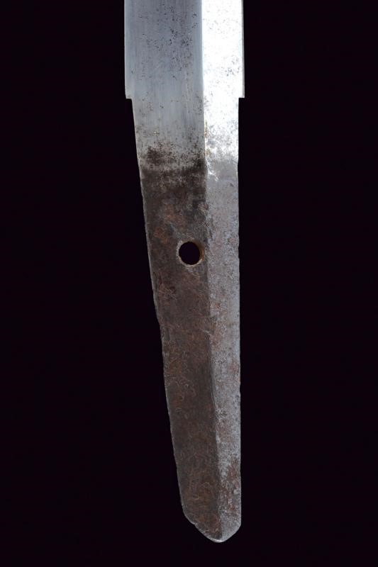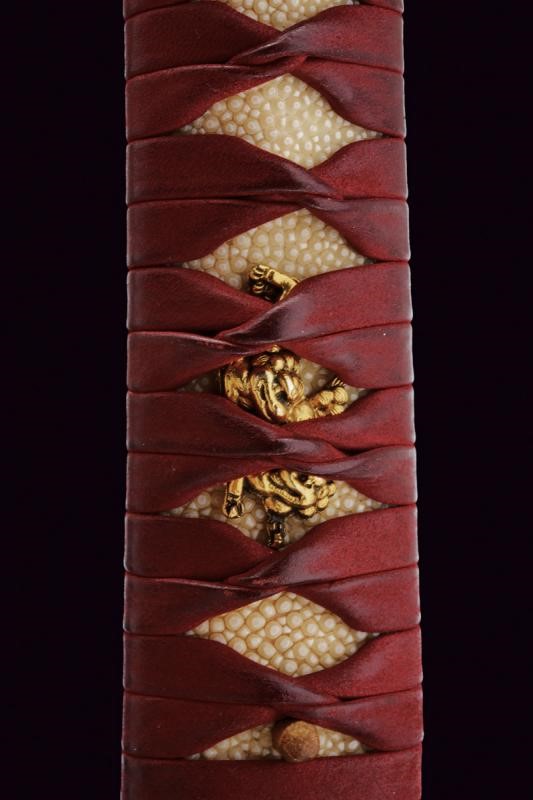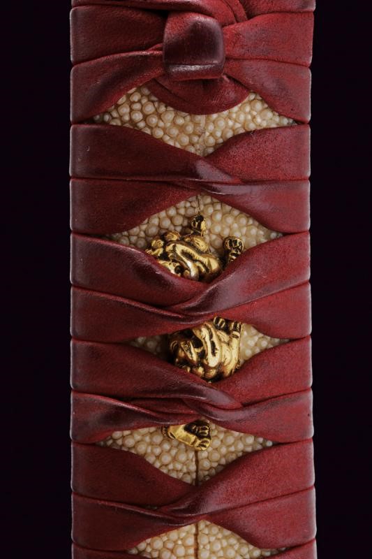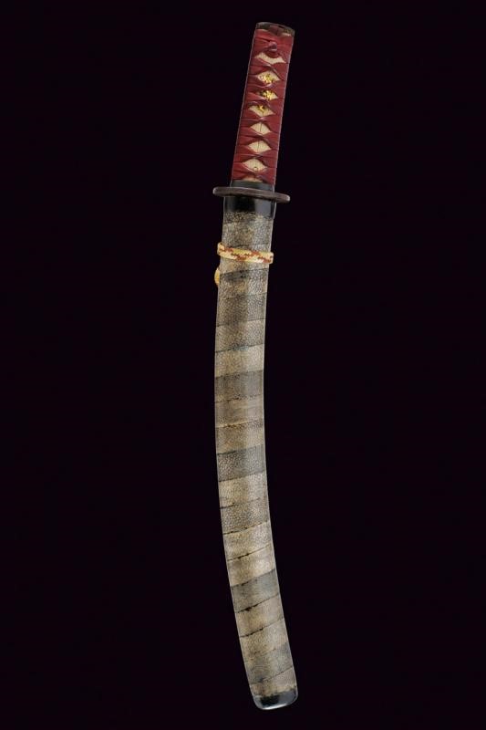 Shobu-zukuri blade. Nagasa: 33.9 cm. Barely visible hamon and hada. Nakago-jiri: Iriyamagata. Mumei. One Mekugi-ana. Copper Habaki. In Koshirae with iron Tsuba-mei Maru-gata of the Edo period decorated with landscapes and small gilt elements in relief. Unpaired Fuchi-kashira, the former of Shakudo-nanako type, the latter made of rusty iron. Even later Tsuka with ray-skin Same, red leather Tsuka-ito, menuki with golden Shishi lions. Saya of later production with ray-skin covering.
