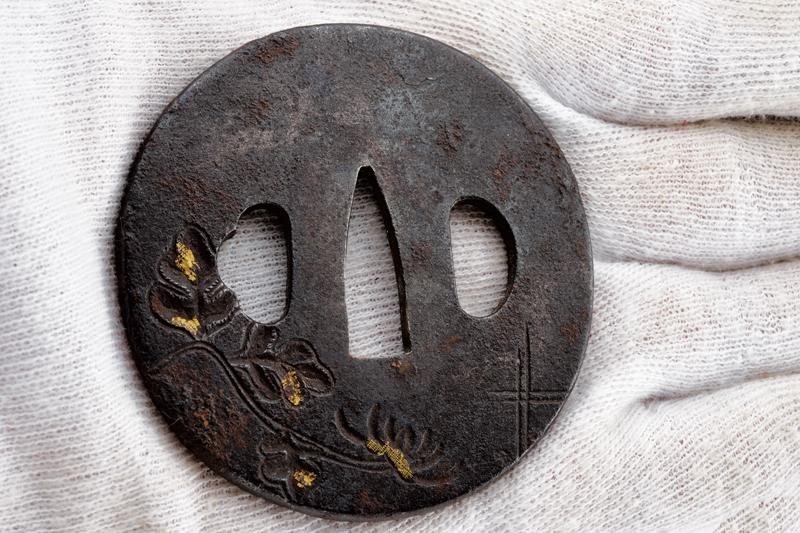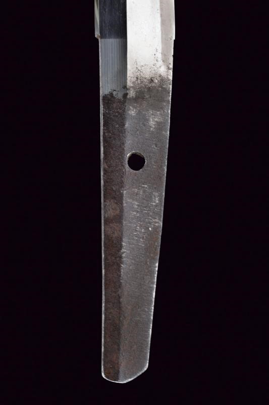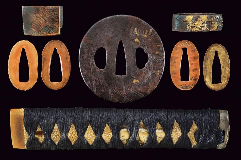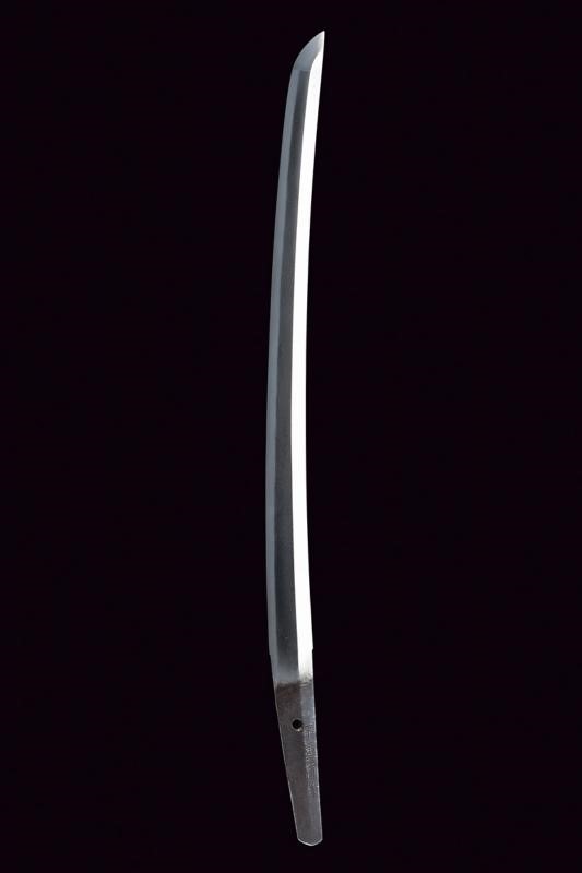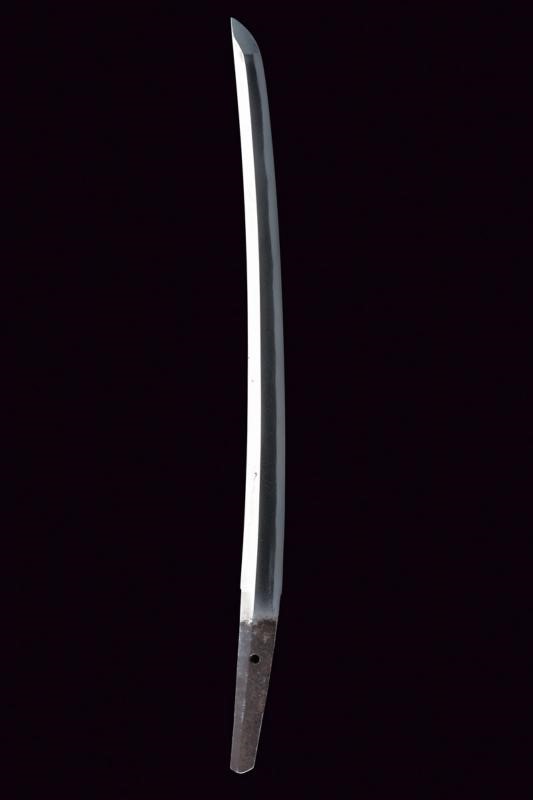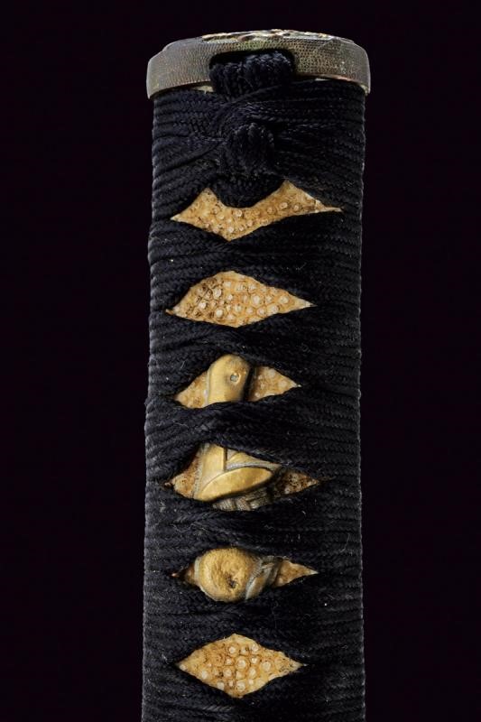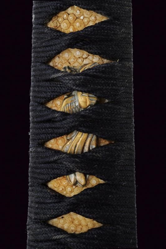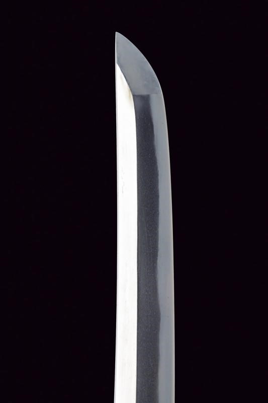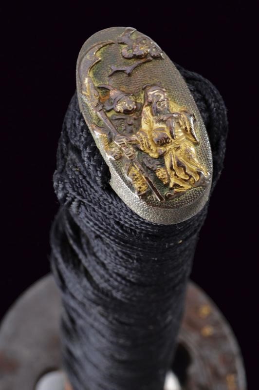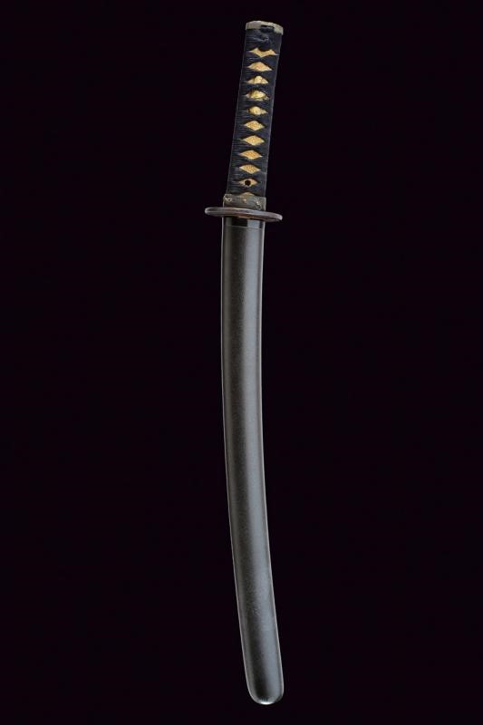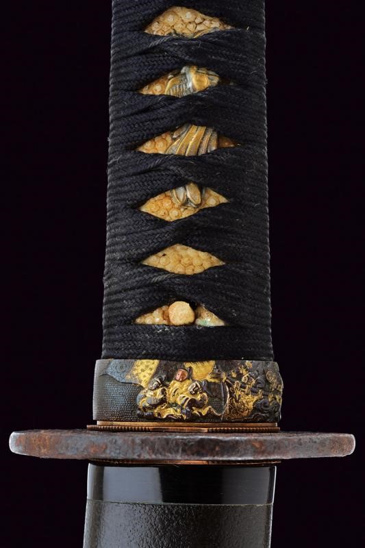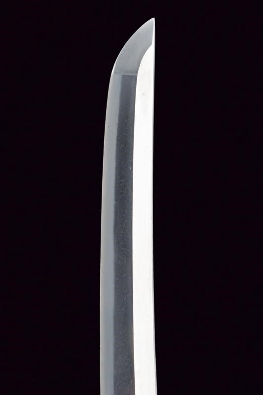 Shinogi-zukuri blade, Iori-mune. Nagasa: 37,8 cm. Rather visible hamon and hada. Some kizu, probably not serious. A Kirikomi near the back (sign of fighting!). Some kiss on the Shinogi. Nakago-jiri: Ha-agari-kurijiri. Mei: Taira Shigeyuki saku. One Mekugi-ana. Copper habaki. In koshirae of Edo period with tsuba Maru-gata carved with floral motifs and with remains of gilding. Fuchi and kashira in Shakudo with characters in relief and gilding. Brass menuki. Tsuka-ito (later?) in black cloth. Saya in later brown lacquer.